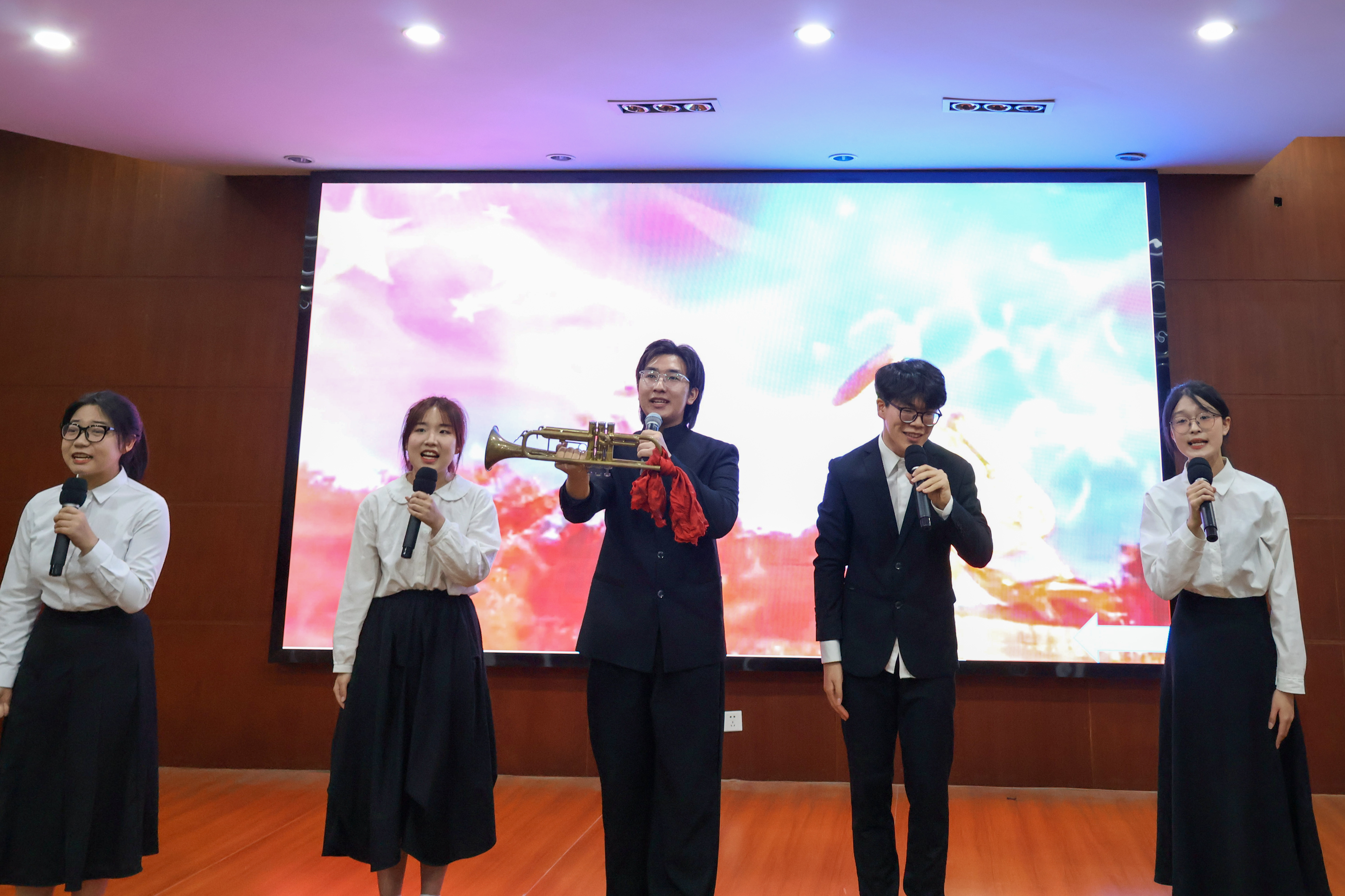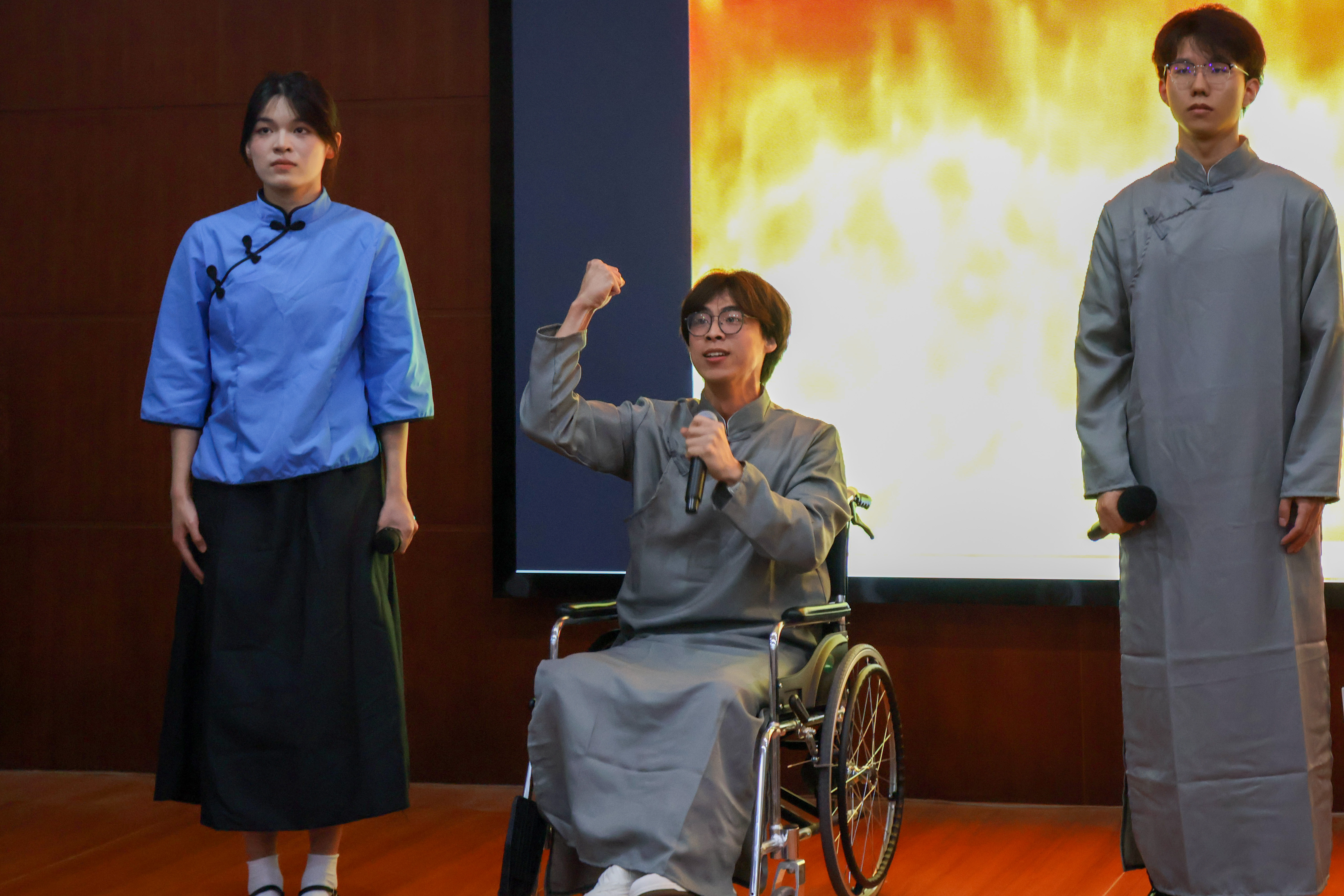 “啊,我的南方和北方,我的永远的故乡和天堂”,祖国大好河山在一声声激情的朗诵中尽收眼底。郭沫若所作《凤凰涅槃》,讲述了凤凰从烈焰中新生的神话传说,选手们在情感充沛的演绎中,用直击人心的声音告诉所有人,神话的背后,是对中华民族新生、解放的热切企盼,是不可遏止的爱国主义激情。五四运动汹涌澎湃的呼喊声还回荡在耳边,过去和现在用语言和文字开启了对话:“今夜,你们一定会有梦,梦回故乡!”海子的《祖国,或以梦为马》,带领全场观众重回1987年,携手在时代的转角,拨开纷纭繁复的迷雾,以磅礴和震撼的气势,追寻光明和信仰以及远方的梦。如果说海子在追寻着自己的信念,那么《英雄》则热情地赞颂了每一位为了中华民族伟大复兴的梦想而前赴后继的人。那唤醒了中华民族的号角声,在《吹号者》的诵读声结束后,依然振聋发聩。