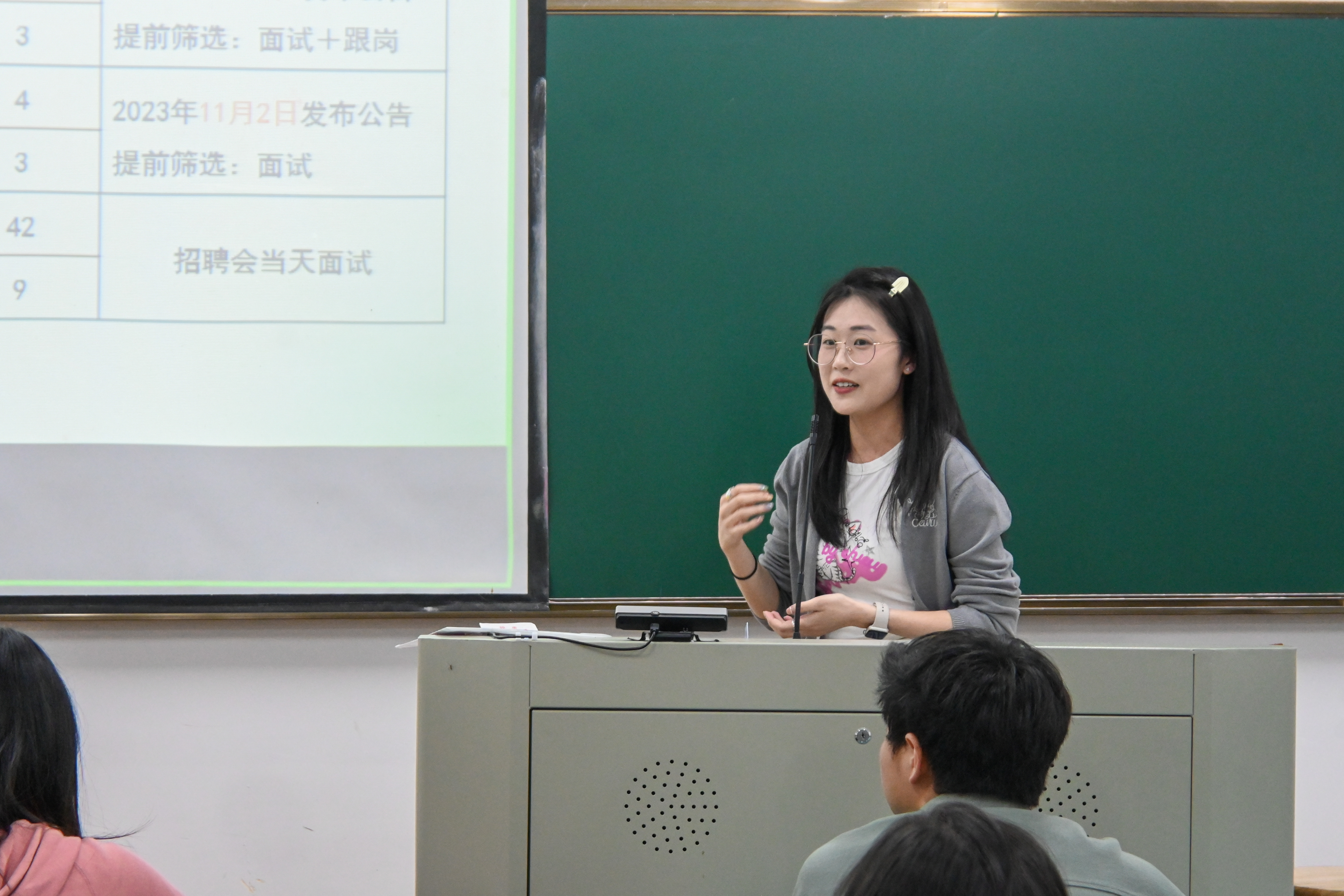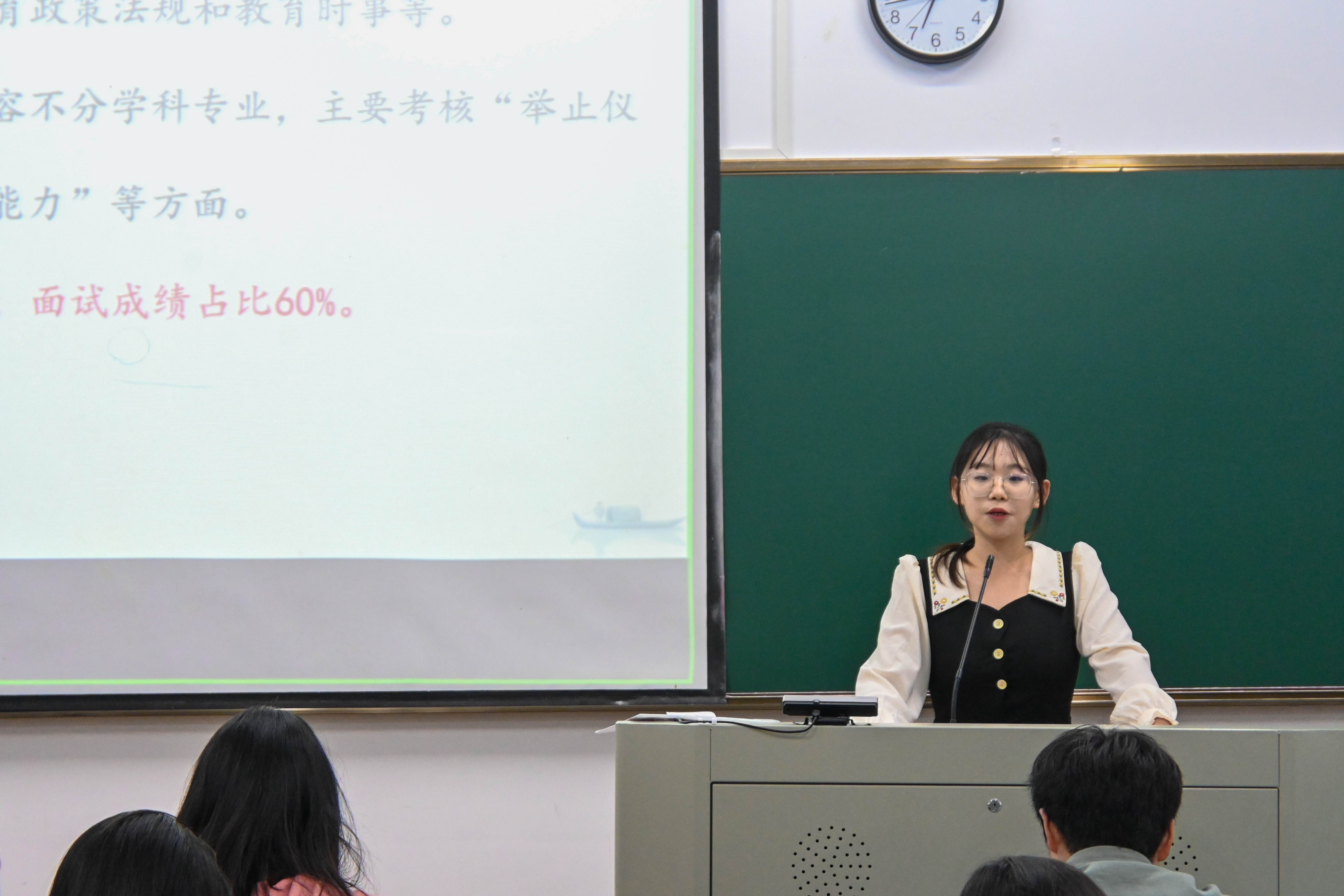 戴益萍学姐介绍了绍兴各地区招聘要求,强调个人简历及材料证明的准备应认真仔细,给评审老师留下更深刻的印象。她还提到,结构化面试注重表达能力与思维能力,试讲则注重相关笔记的整理修改以及适当的准备方式。