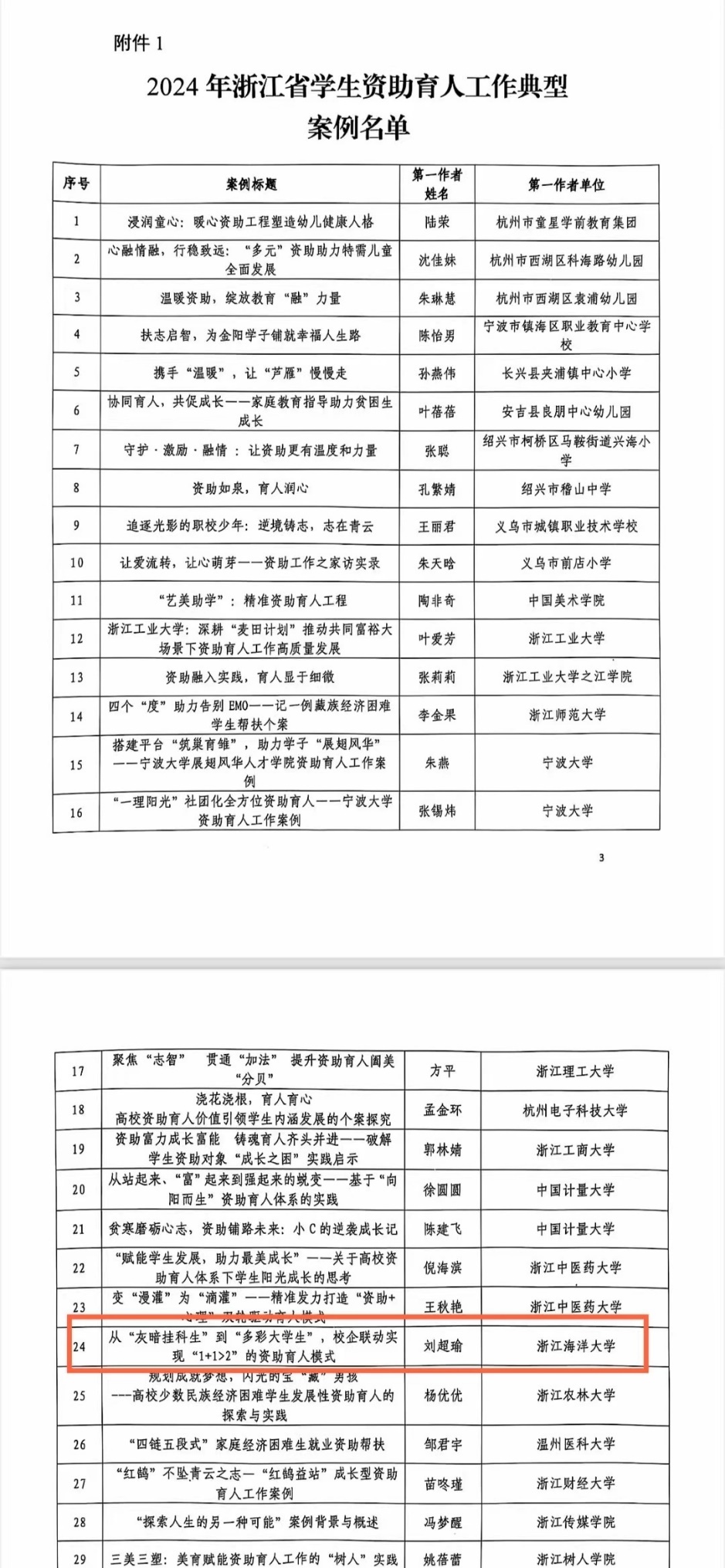 近日,yl9193永利集团刘超瑜老师的工作案例《从“灰暗挂科生”到“多彩大学生”,校企联动实现“1+1>2”的资助育人模式》入选2024年浙江省学生资助育人工作典型案例,经过专家严格遴选和合议会审等环节,本案例从全省335篇案例中脱颖而出,成功入选。