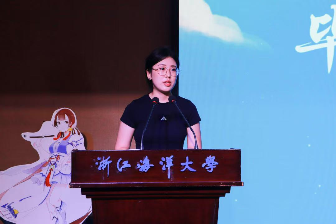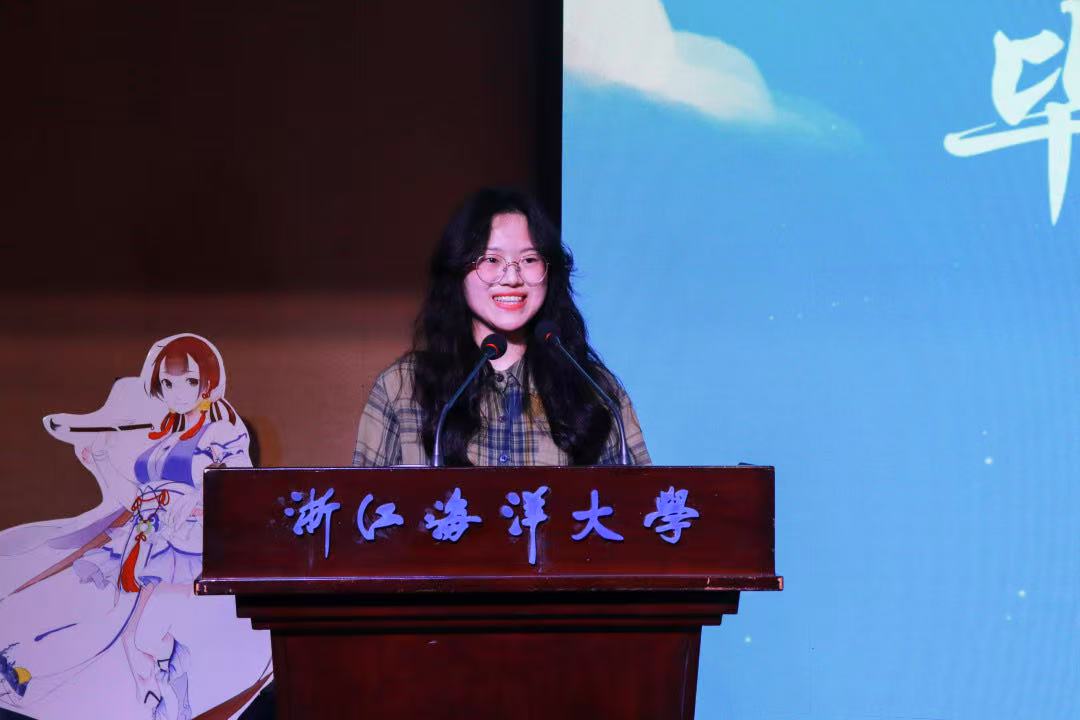 在学生代表发言环节,班长代表董安琪对全班同学的陪伴表达了衷心感谢,感恩相遇的缘分,并鼓励大家把握时代机遇,勇敢追寻热爱;团支书代表洪洁回忆起与同学们共同学习的美好时光,感谢大家的支持与配合工作,衷心祝愿老师和同学们未来一切顺利;学习委员代表陈冰依则追忆起同学们深夜备考的场景,感慨青春记忆的珍贵,希望大家带着这份热忱,勇毅前行。