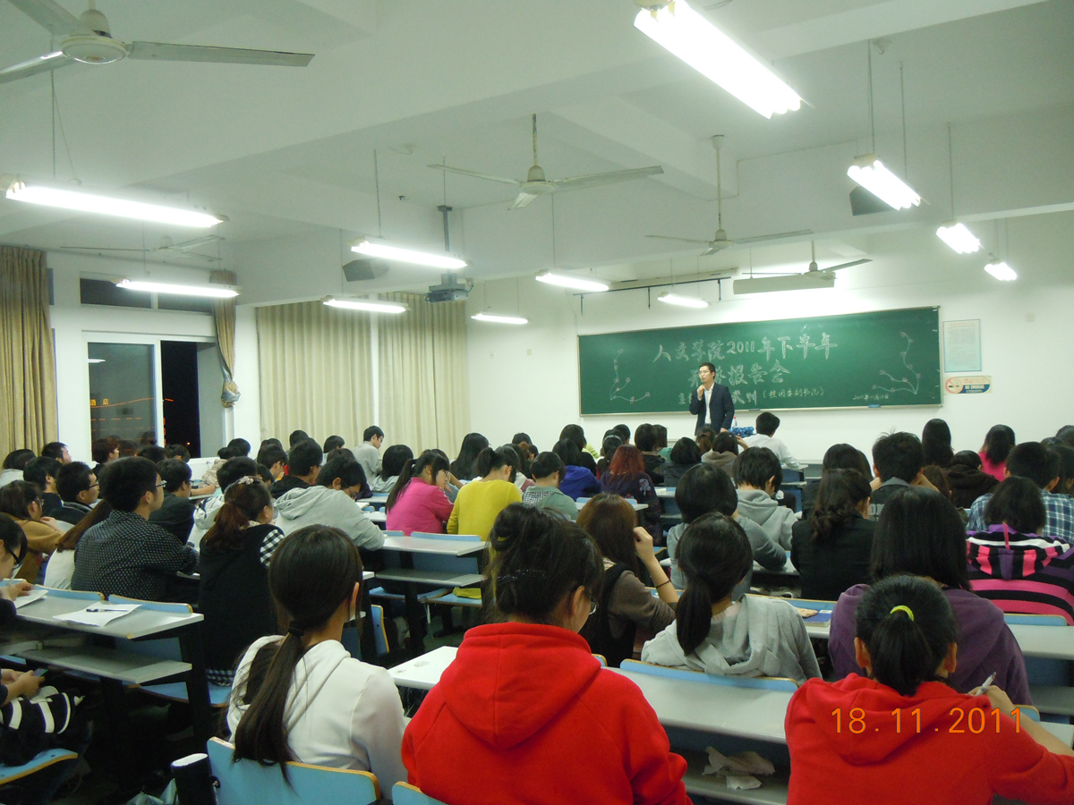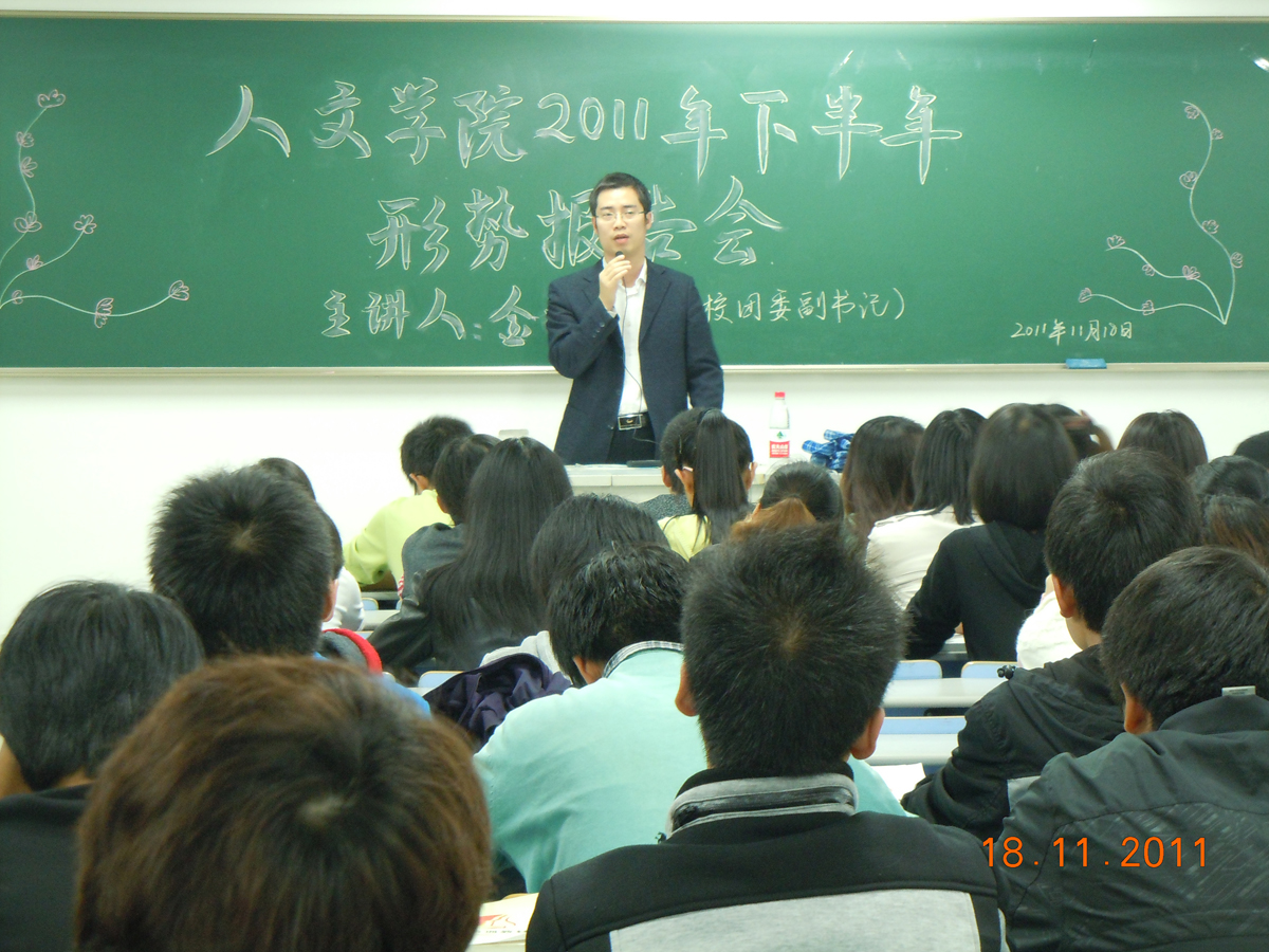 2011年11月18日晚,人文学院在东校区教学楼411教室举行了2011年下半年形势报告会,本次报告会邀请了校团委副书记金武州老师担任主讲嘉宾。人文学院分团委书记朱柏军、各班级学生干部(代表),分团委、学生会等学生组织的主要学生干部共计120余人参加了此次报告会,报告会在一片热烈的掌声中开始。