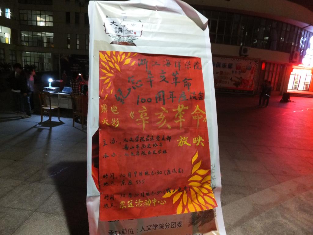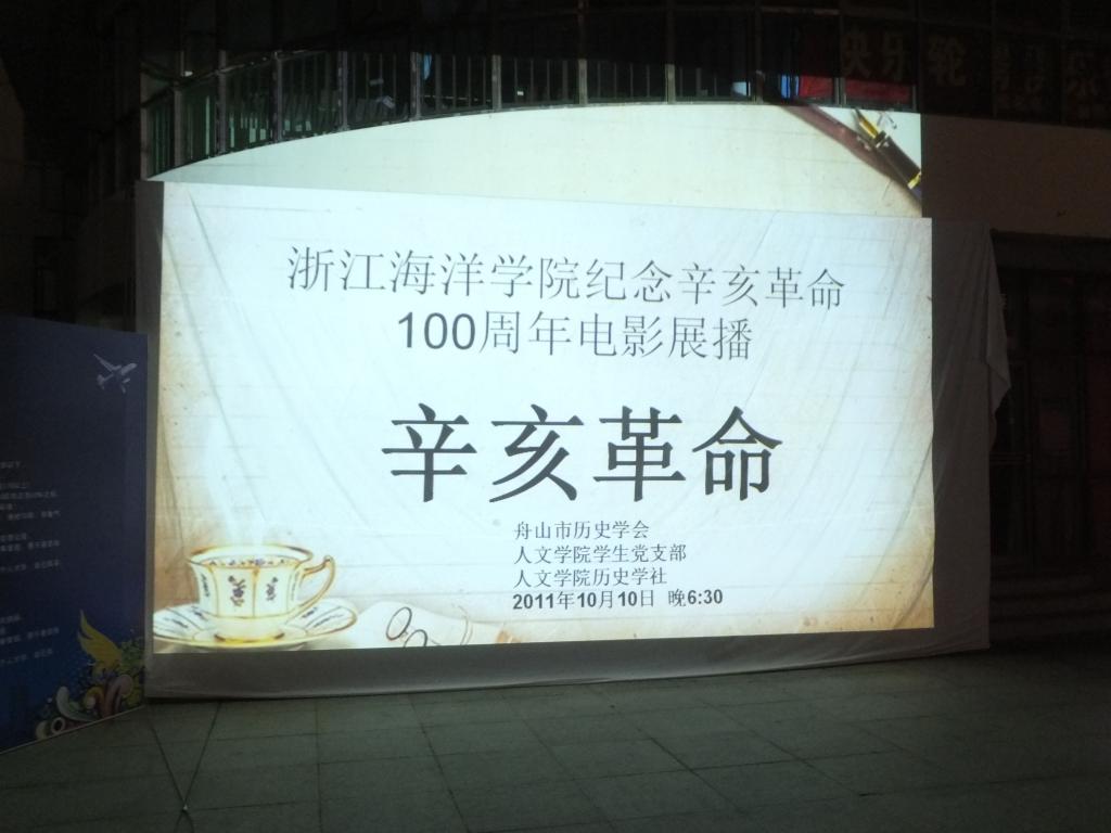 为纪念辛亥革命100周年、接受革命教育,人文学院与2011年10月10日晚在东校区广场组织了由舟山市历史学会、人文学院党总支主办,人文学院学生党支部、人文学院社团联合会、历史学社承办的露天电影《辛亥革命》。
