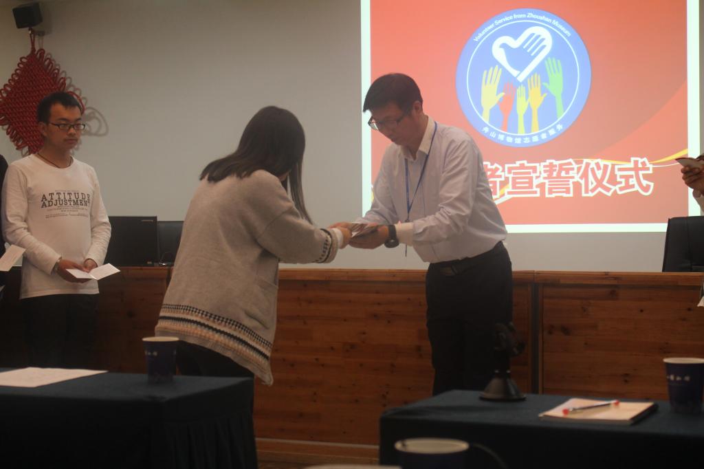 培训于上午9点开始。在20分钟左右的开班仪式结束后,博物馆的王程凯老师向大家诠释了博物馆与博物馆志愿者这一概念。他从博物馆的分类、等级划分说起,以法国罗浮宫、大英博物馆等知名博物馆为例,解释了博物馆的教育、研究和欣赏作用以及收藏、保护并向公众展示的作用。随后,王老师教授学员接待礼仪,并请学员上台演示,以此纠正他们的不规范动作。下午,由白书升老师向大家讲解舟山博物馆的建设和展陈,分别介绍了博物馆在海洋、生物、历史、渔业等方面的藏品。随后举行了宣誓仪式,所有学员左手持志愿者手册,右手高举,宣誓成为一名博物馆志愿者,为社会服务。最后,在王程凯老师的带领与解说下,所有学员参观了舟山博物馆,为期一天的培训课程圆满结束。