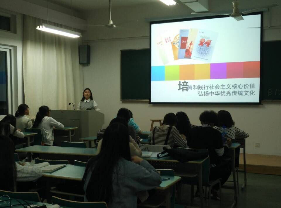 晚上六时,E15中文全体同学在教学楼556教室举行了以“培育和践行社会主义核心价值观,弘扬中华优秀传统文化”为主题的班会。