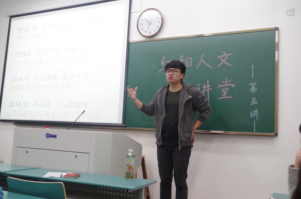 11月22日18:00,人文学院红阳人文大讲堂第五讲在公共教学楼426教室举行。本次大讲堂邀请了人文学院11级校友、现南海实验学校教师洪佳铖为大家主讲。他以“鲜花在远方,而我们永远在路上”为主题,与大家一起分享他大学四年的成长历程及其中的宝贵经验。