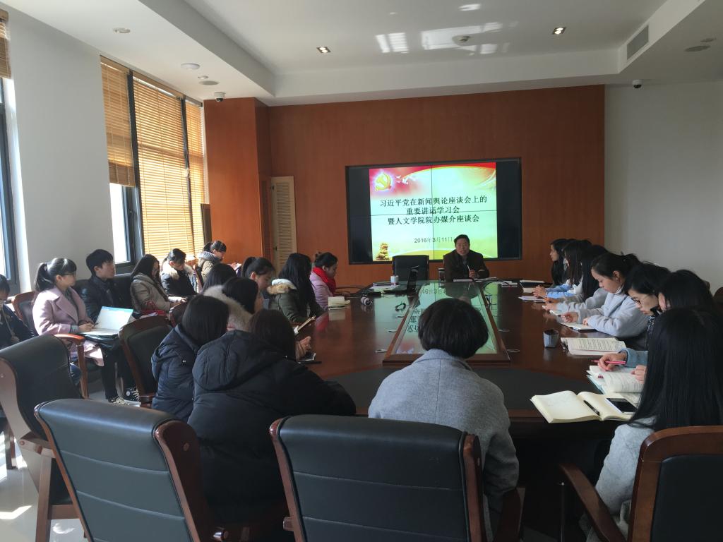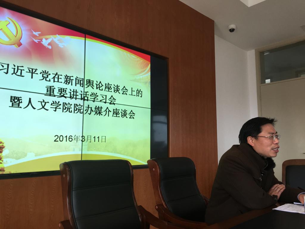 中午12:30,人文学院召开习近平在党的新闻舆论工作座谈会上的重要讲话学习会暨人文学院院办媒介座谈会。人文学院党委书记许金权、辅导员傅林静组织本次会议,人文学院部分学生党员以及学院信息部、宣传部、学院杂志的负责学生参加本次会议。