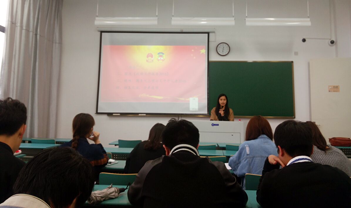 本次学习讨论会由回顾两会主要内容、图说《政府工作报告》、观看视频、主题发言与总结发言5个部分组成。首先在人文学院学生党员刘佳怡的带领下,大家简要回顾了两会主要热点问题,利用图片讲解的形式着重从2015年工作回顾、“十三五”时期主要目标任务和重大举措、2016年主要预期目标与重点工作这三大方面速览《政府工作报告2016》。接着,播放国务院总理李克强会见中外记者视频,让大家积极分享两会学习心得体会。讨论环节中,全体学员不仅就当前我国经济发展形势、科技发展、生态文明建设、医疗体制改革等社会热点问题进行了讨论;还从自身生活出发,谈及对大学生创业、“互联网+”创新产业链发展模式等问题的见解,并纷纷表示将在会后积极地对国家时事做进一步的了解,紧跟时代发展趋势。