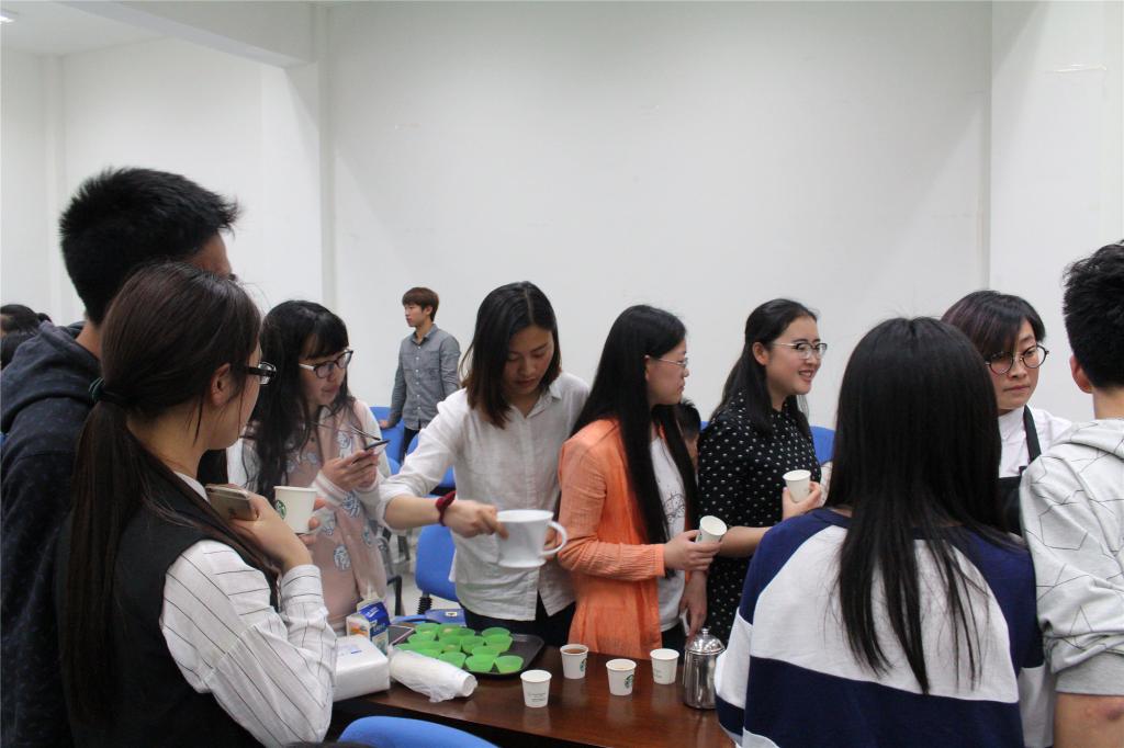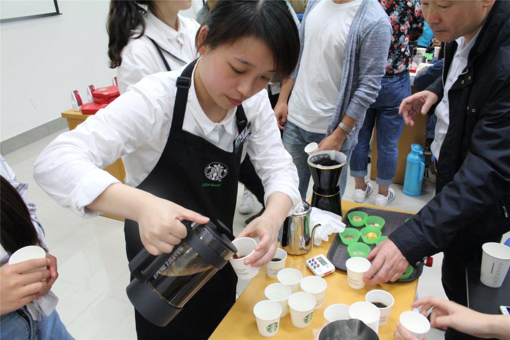 本次讲座分为三个部分:讲解咖啡的一生、动手做咖啡、诉说海大与星巴克的渊源。咖啡师丽娜首先为大家介绍了咖啡的起源、历史,咖啡豆的种植、加工方法和烘焙,咖啡器具和冲泡方法,咖啡的种类和功效。通过讲解和展示,同学们了解到:起源于埃塞俄比亚的咖啡豆,最初的尝味者是一群牧羊;咖啡的种类繁多,卡布奇诺、摩卡等都拥有自己独特的风味;不同的咖啡需要不同的器皿来冲泡,由此才能展现出咖啡最独到的魅力。咖啡制作环节更是热闹,同学们在咖啡师的亲手指导下,怀揣着欣喜与热情动手制作咖啡,带着期盼细细品尝咖啡的味道,感受到真正的咖啡豆磨出来的咖啡是酸涩、苦香夹杂着些许咸味的。现场充溢着咖啡的醇香,美妙得让人沉醉。星巴克与海大有着解不开的缘分。据了解,舟山地区一家星巴克门店50%的工作人员来自海大,有很多学生在星巴克成长——从兼职到值班经理,一步步努力付出,最终做到门店经理的位置。那些关于梦想的记忆属于星巴克也属于海大。