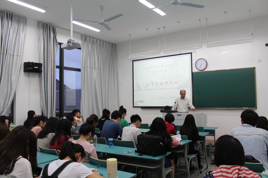 晚6:30,人文学院第十一届传统文化节“舞文弄墨”之汉字与中国海洋文化讲座在长峙校区教学楼426顺利举行。本次讲座邀人文学院胡世文教授作主讲人,人文学院学生参与并聆听了此次讲座。