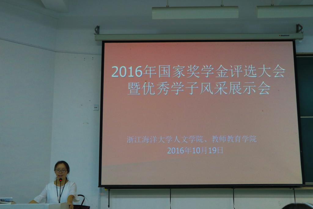 晚6点,人文学院、教师教育学院2015-2016学年国家奖学金评选大会暨优秀学子风采展示会于定海校区教学楼153教室顺利举行。本次大会由人文学院、教师教育学院辅导员朱丽芳主持,候选的七位优秀学子展示了自己的风采。
