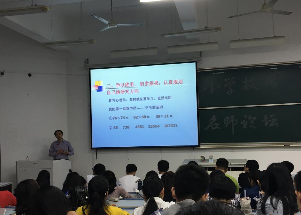 老师首先分享了自己由代课教师到特级教师的经历,在座的学生都惊叹不已。谈到如何提高学生的成绩,他提出“兴趣是最好的老师”,使学生对学习感兴趣才是最有效的办法,并举了“首同末合十”这一经典数学技巧能够引起学生学习兴趣的事例。随后,