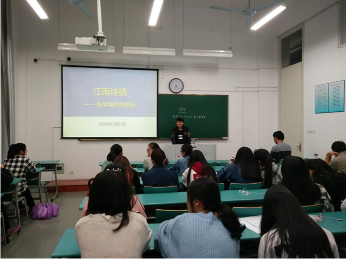 接着,在大家的热烈掌声中,在古典诗词领域颇有研究的张学强同学走上讲台,开始以“江南诗话”为主题的讲座。张同学详尽讲解了古体诗歌的分类,并以王维的《山居秋瞑》为例,讲解诗歌的平仄问题,还引用王国维、王力诸位先生的论述,提出自己的见解:诗词需出新意、善用虚词、讲求炼字。讲座最后,张同学立足现在诗歌创作情况,希望同学们在科技日益发达的今天,保持一颗对大自然的热爱和赤子之心,坚持诗词创作。