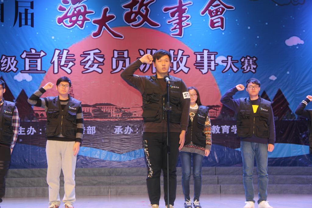 首先,陈宏祖部长对首届“海大故事会”的举办以及全媒体报道组成立的意义予以肯定,总结了学校新闻中心成立以来取得的成绩并鼓励同学们积极加入学校的新闻宣传工作的队伍中来。接着,全媒体报道组成立仪式开始。主持人宣读相关文件以及报道组成员名单后,各二级学院书记为代表团分发队服,代表团身着队服,在学生代表王哲的带领下进行宣誓,表达了将青春和热血投入到学校宣传新闻工作中的决心。