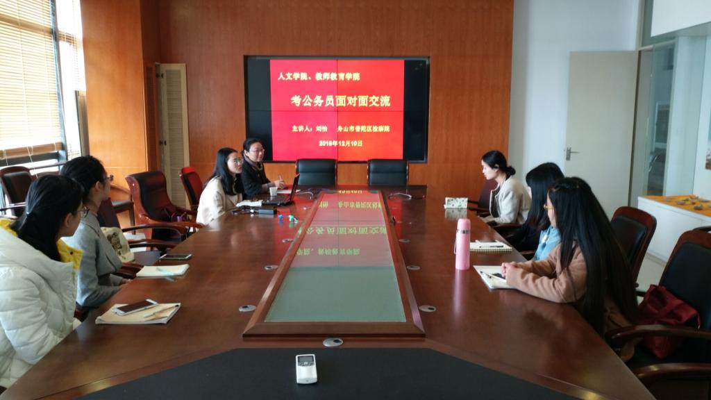 12月10日上午九点半,人文、教育学院于长峙校区文理科楼418会议室举办了考公交流分享会。本次讲座邀请了今年考取舟山市普陀区检察院公务员的优秀校友刘怡学姐为主讲人,有志于报考公务员的大三同学积极参加。