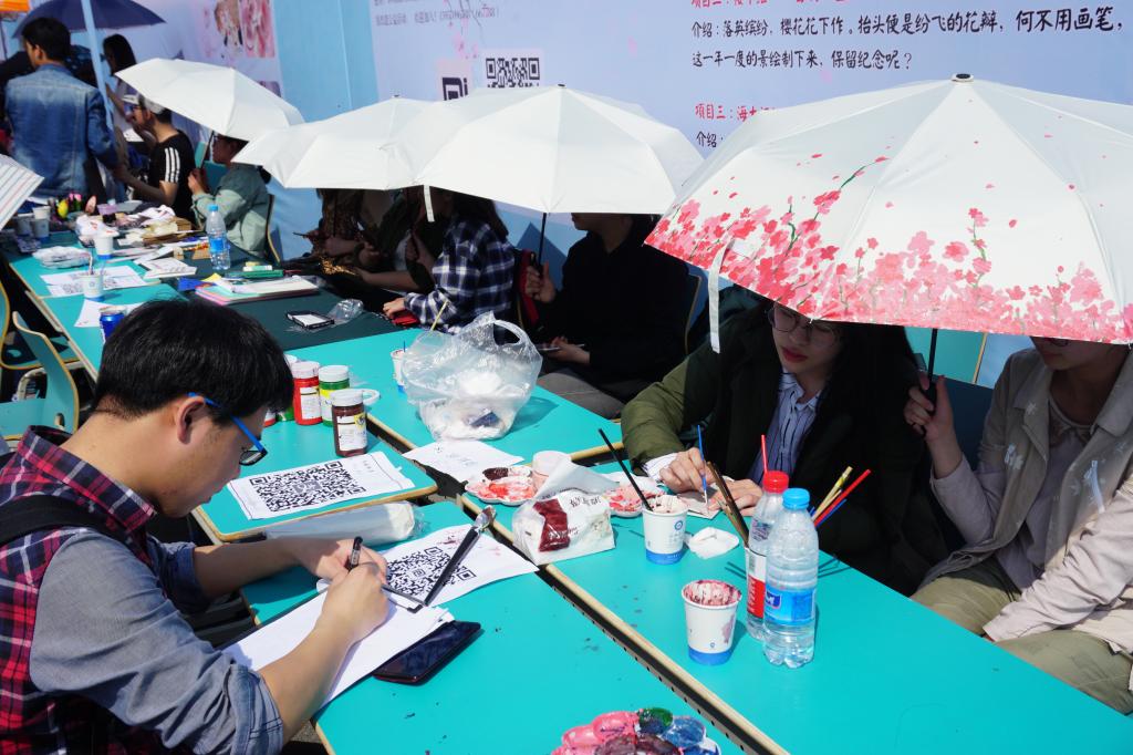 乘衣归汉服社、绘画社、创意绘画社、清风诗社、青衣戏曲社、海洋文化研究协会等社团都在樱花节中开展了丰富多彩的活动,吸引了大批市民。汉服社的社员们在樱花树下,身着汉服,仿古人行成人礼,现场还为市民提供免费汉服体验活动。绘画社、创意绘画社则通过的各种手绘活动展现了“海大”的独特魅力,如制作樱花纸伞、手绘扇子、彩绘石头、个性书签等,充分展现了同学们的创作能力。清风诗社的樱花树下读诗活动以及青衣戏曲社的魅力表演,同样十分精彩,体现了我院特有的人文风情。此外,文理楼海洋文化教学平台的开放也让许多市民在学习海洋文化知识的同时近距离领略了海洋文化的魅力。
