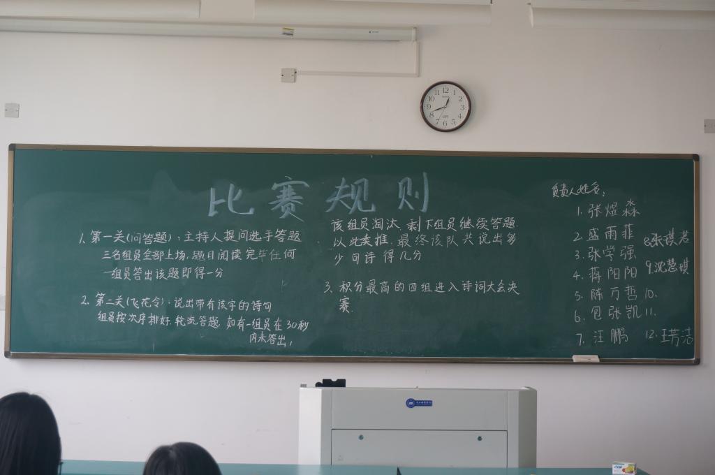 本次比赛共有13组同学参加。赛前,等候区内气氛融洽,各位参赛人员互相讨论诗词以及个人见解,每位选手也都使出浑身解数认真参与其中。初赛内容主要包括问答题和飞花令两部分,最后得分最高的四组可进入5月份诗词大会决赛。其中张煜淼率领的第一组表现最为突出,在问答中反应迅速应答机敏,并且在飞花令中该组也表现出对诗句的充分掌握与理解。同学们虽因比赛而感到紧张,但依然发挥稳定,每位选手都保持着认真积极的态度对待比赛。最后,张煜淼、汪鹏、叶雨萱、蒋阳阳带领的四组同学脱颖而出进入决赛。