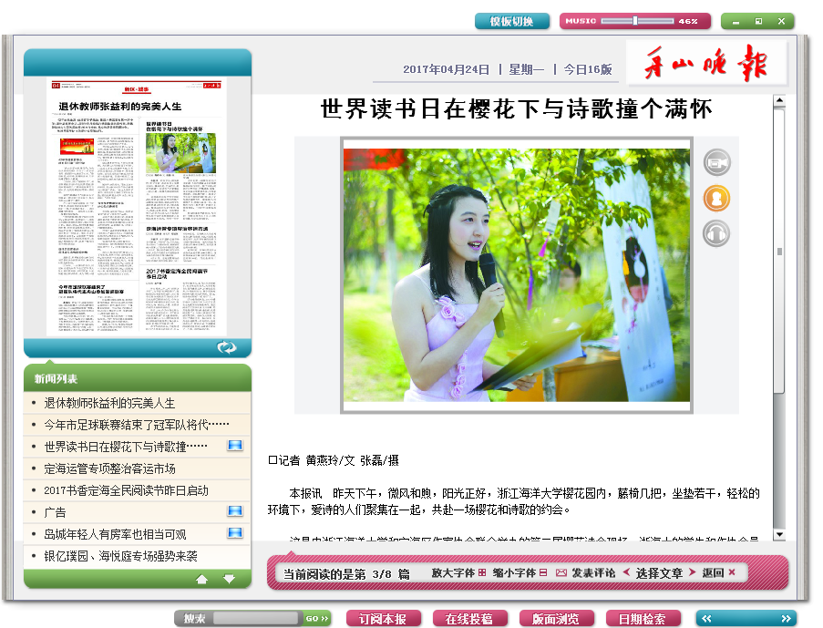 报道称:这是由永利集团官网人文、教育学院和定海区作家协会联合举办的第二届樱花诗会现场,浙海大的学生和作协会员纷纷带来了朗诵作品。整场活动分为4个章节:春天、海洋、花赋、锦绣。现场樱花树下,许多舟山诗人关于春天的作品被声情并茂地朗诵着:《春到江南》《在春天,倾听一种声音》《我想坐在樱花树上》《樱花茶》等。