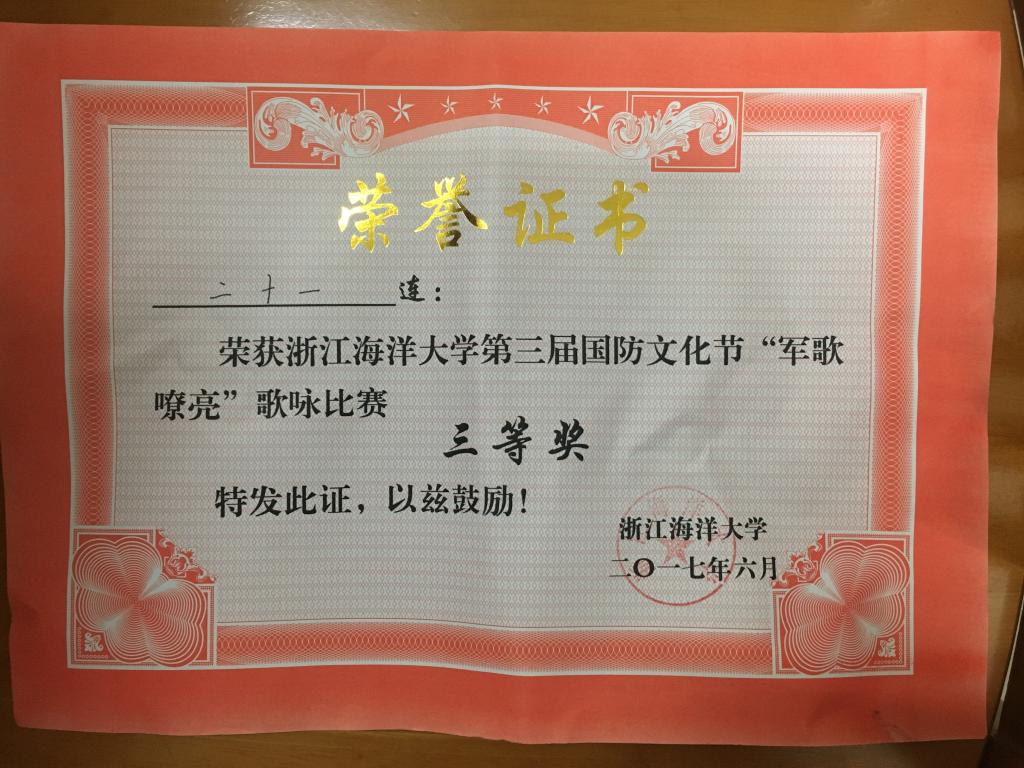 本次比赛共3个营队参加,由22支连队组成,人文学院、教师教育学院16级新生组成的二十连与二十一连以《军港之夜》和《当那一天来临》参加本次比赛。比赛时,指挥的娴熟动作,领唱和合唱之间的完好衔接,动作的整齐程度、面部表情的生动活泼、歌声的雄壮嘹亮,无不体现了文教学生青春活力、团结向上的优良传统,充分体现文教学子的奉献,爱国情怀。在场的所有师生和评委无不深深被这振奋人心的歌声打动。最终,二十连与二十一连分别以高分获得本次合唱比赛的二等奖与三等奖。