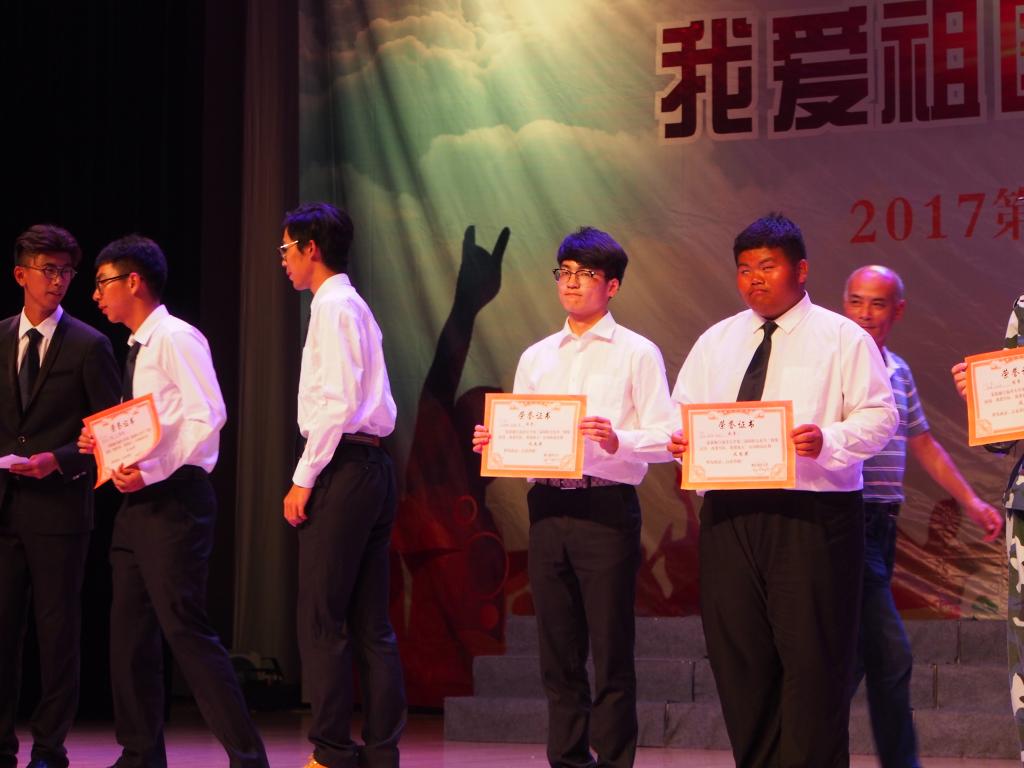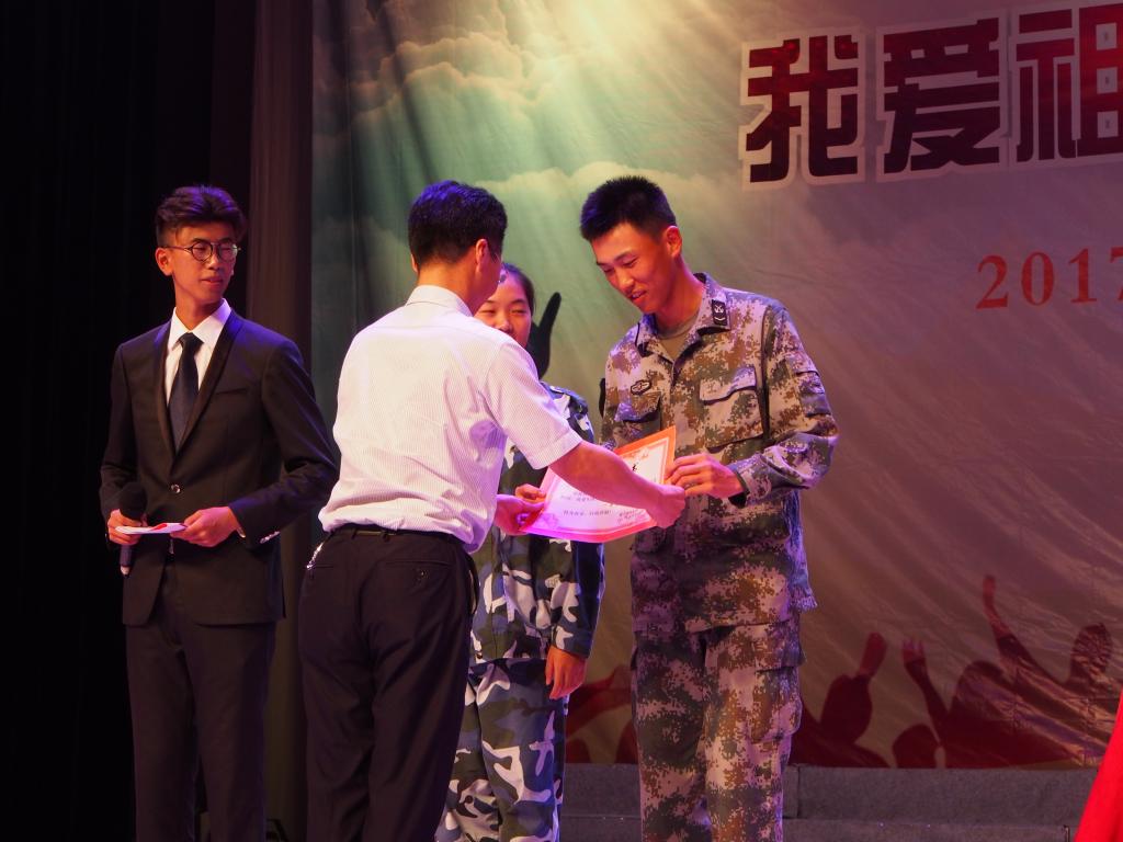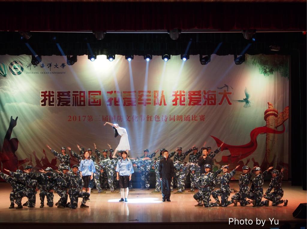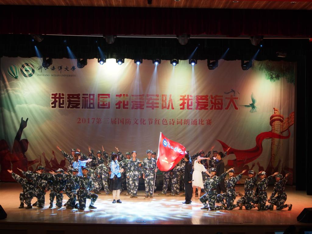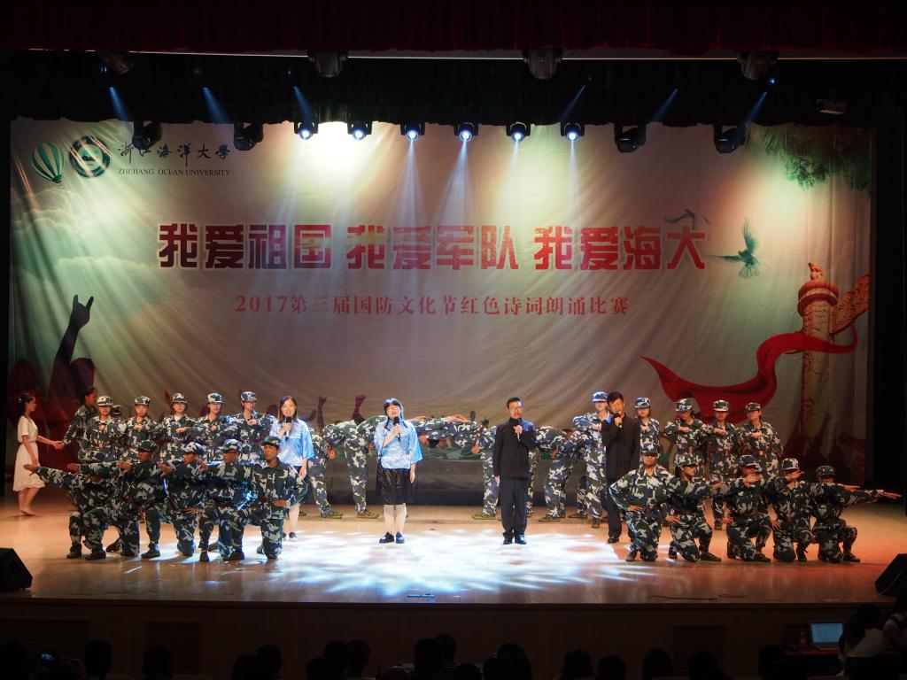 纪念中国人民解放军建军90周年,喜迎党的十九大召开,并且进一步让海大学生了解祖国辉煌历史,感受军队发展壮大历程,珍惜学校良好育人环境激发学生爱国热情和爱校情怀,2017年7月8日,“我爱祖国,我爱军队,我爱海大”诗歌朗诵大赛在杨存国会展中心成功举办。校党委副书记吴中平,校副校长谢永和,体育与军训教育部主任黄永良,学工部、学生处副处长芦茜,舟山警备区的军训团团长俞建林,全体军训教官,各二级学院党委书记出席本次朗诵比赛。永利集团官网语言文字委员会徐波老师,人文、教育学院秦良杰老师,美育工作委员会艺术于志新老师、俞海静老师,校团委副书记姜伟老师担任本次比赛评委。