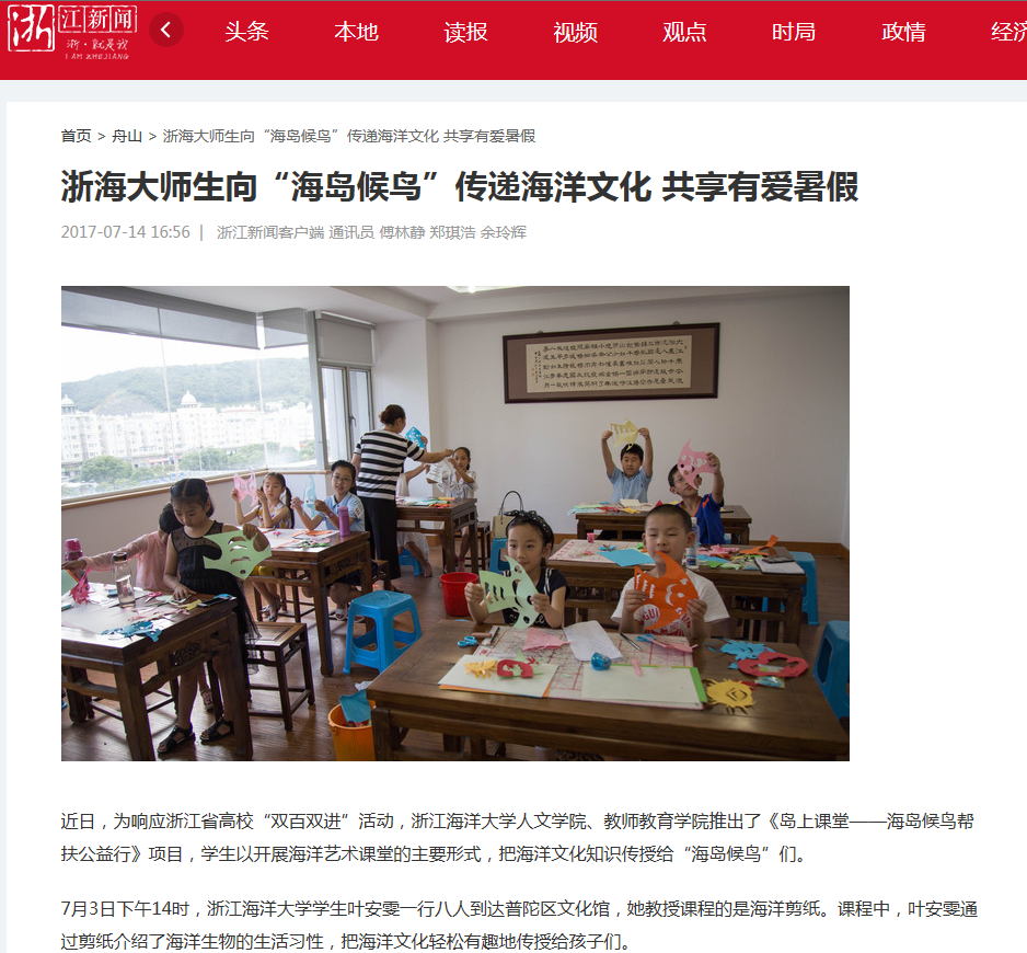 浙海大师生向“海岛候鸟”传递海洋文化 共享有爱暑假,浙江新闻客户端7月14日报道,通讯员:郑琪浩 傅林静 余玲辉 详见链接:http://zj.zjol.com.cn/news/698175.html?from=timeline&isappinstalled=0