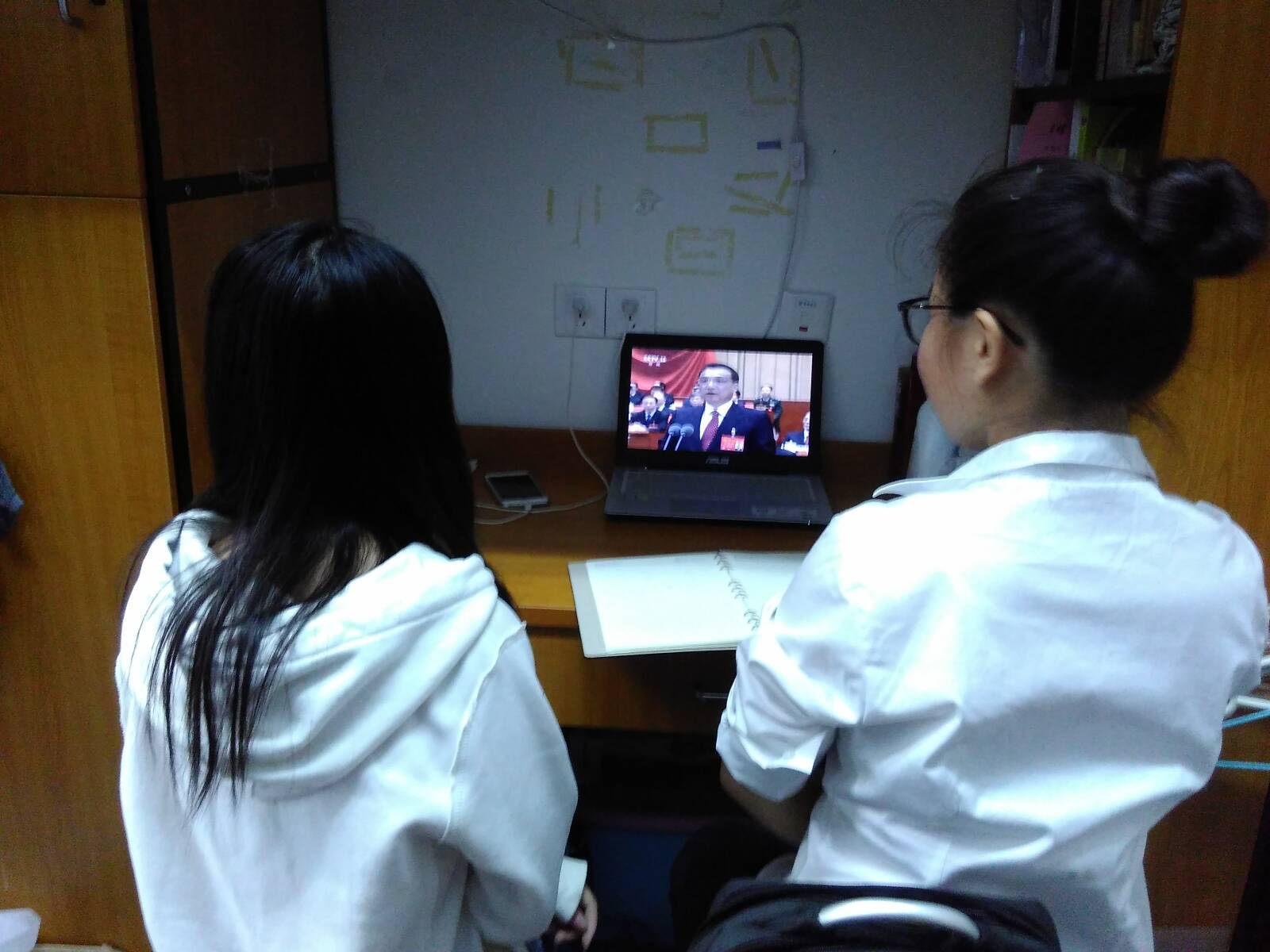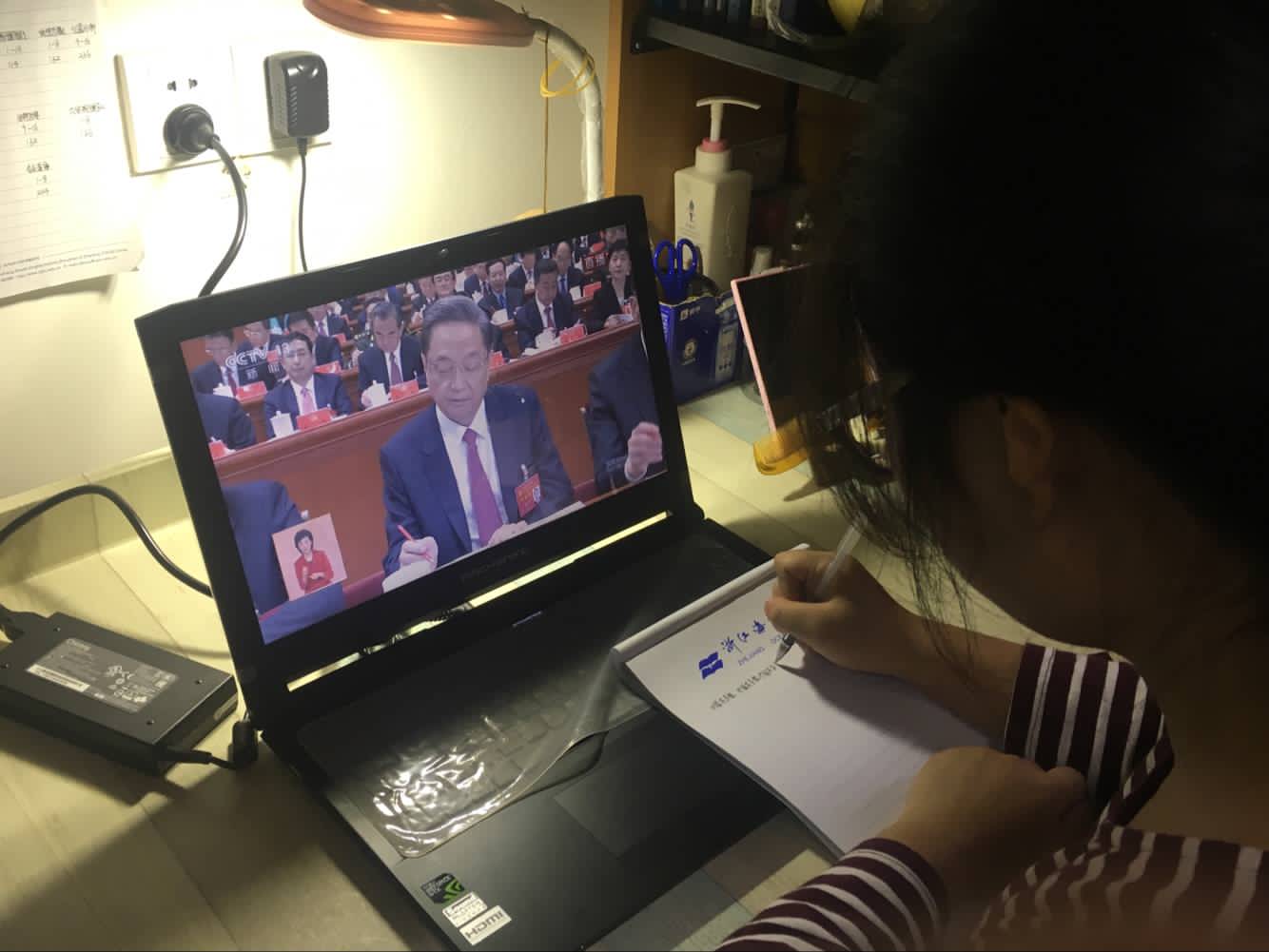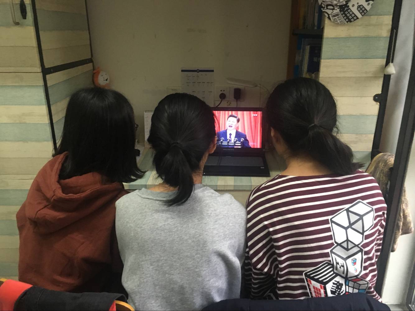 学生在寝室收看党的十九大开幕会转播