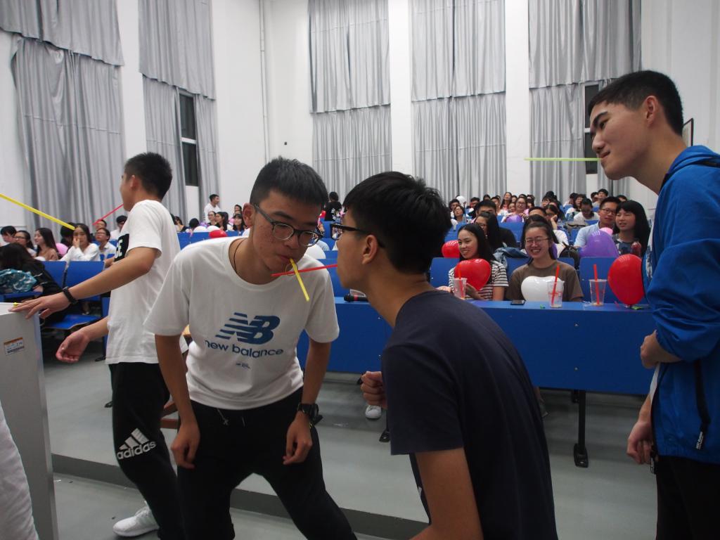 首先每位同学抽签决定游戏的分组。为在邬行健的《第三十八年夏至》之后,见面会拉开了序幕。接着,是紧张激动的游戏环节。策划组成员为大家准备了自我介绍、吸管传物、萝卜蹲、找物品等游戏。在找物品游戏过程中,场面十分热烈。找口红,找手表、找鞋带等脑洞引来大家的阵阵欢笑。最后,见面会在全体团学干部合唱《文教小幸运》的歌声中圆满结束。温馨的氛围感染了在场的每一个人,大家都纷纷挥起自己手中的气球和闪光灯。