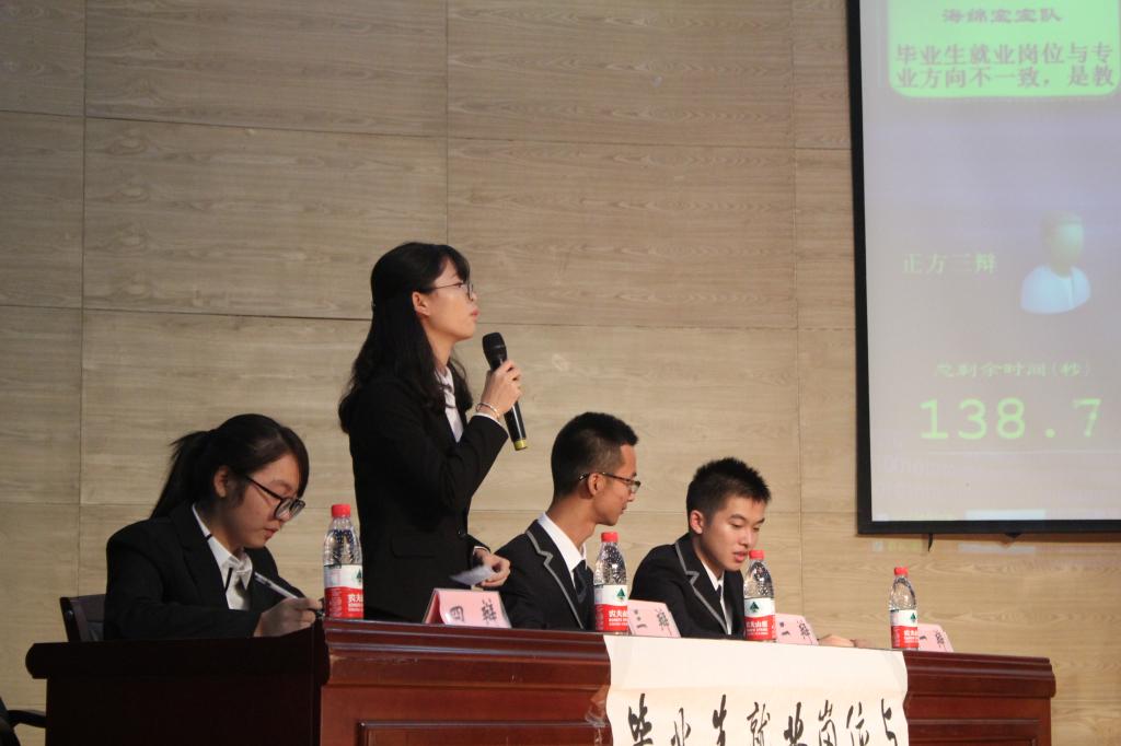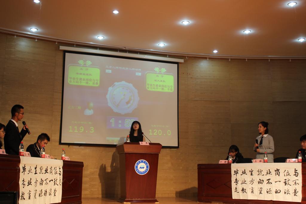比赛一开始便唇枪舌剑,互不相让。反方二辩以浪费永远存在,既然知道错误,为什么不进行改变,来陈述自己的观点。正方举了京杭大运河和北大物理学的学生卖猪肉的例子以表明观点。在自由辩论环节中,正反双方都相当犀利地为自己的观点展开激烈的辩论。反方认为结婚选妻子如此重要的事情也会存在选错的可能性,因此改正错误对未来发展更好。正方则认为学校在大一时便开设了职业生涯规划课,这减少了学生选择错误职业的可能性。在最后的评委点评环节,学姐学长们对双方提出了一些建议,并最终判定正方获胜,反方二辩为最佳辩手。