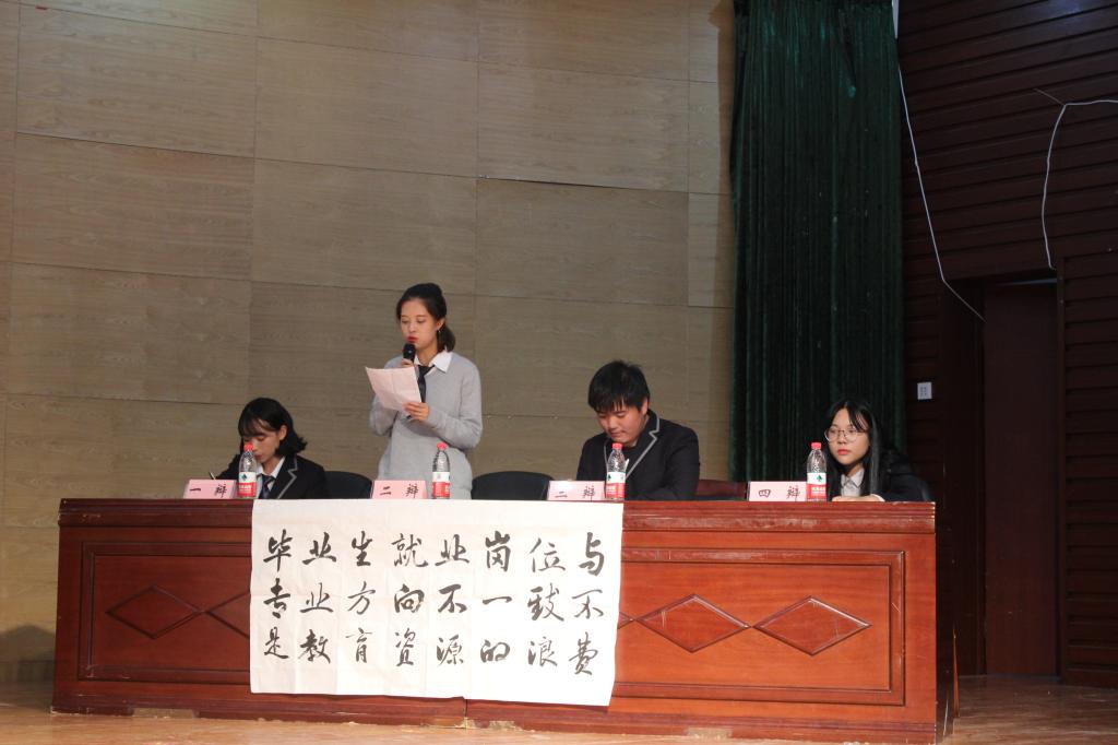 10月8日晚六点半,人文学院﹑教师教育学院辩论赛表演赛于定海校区活动中心二楼顺利举行。本次辩论赛辩题为就业岗位与专业不对口是不是教育资源的浪费。翰林辩论队第八届副队长陈烽、翰林辩论队第九届队长陈丹妮、人文学院争鸣辩论队15级队长方倩颖作为评委出席本次活动,活动由徐文涵主持。