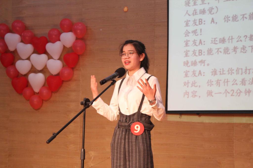 通过初赛选拔脱颖而出的13位选手展开了激烈的角逐。本次决赛分为上下两场。上半场为主题演讲,下半场为情景演讲。赛场上,各位选手以朝气蓬勃的姿态,激昂慷慨的语言,落落大方的台风为观众带来了一场场视觉和听觉上的饕餮盛宴。主题演讲环节,各位选手准备充分,演讲内容异彩纷呈。而更考验选手应变能力的情景演讲,将比赛推向了新的高潮。由校园冷暴力到无人超市的兴起再到共享单车的利弊......选手们敏捷的思维与强大的语言组织能力赢得观众阵阵掌声。最后,徐波老师对本场比赛作出了细致的点评,并提出了真挚的建议,鼓励选手再接再厉,争取在校赛中取得好成绩。