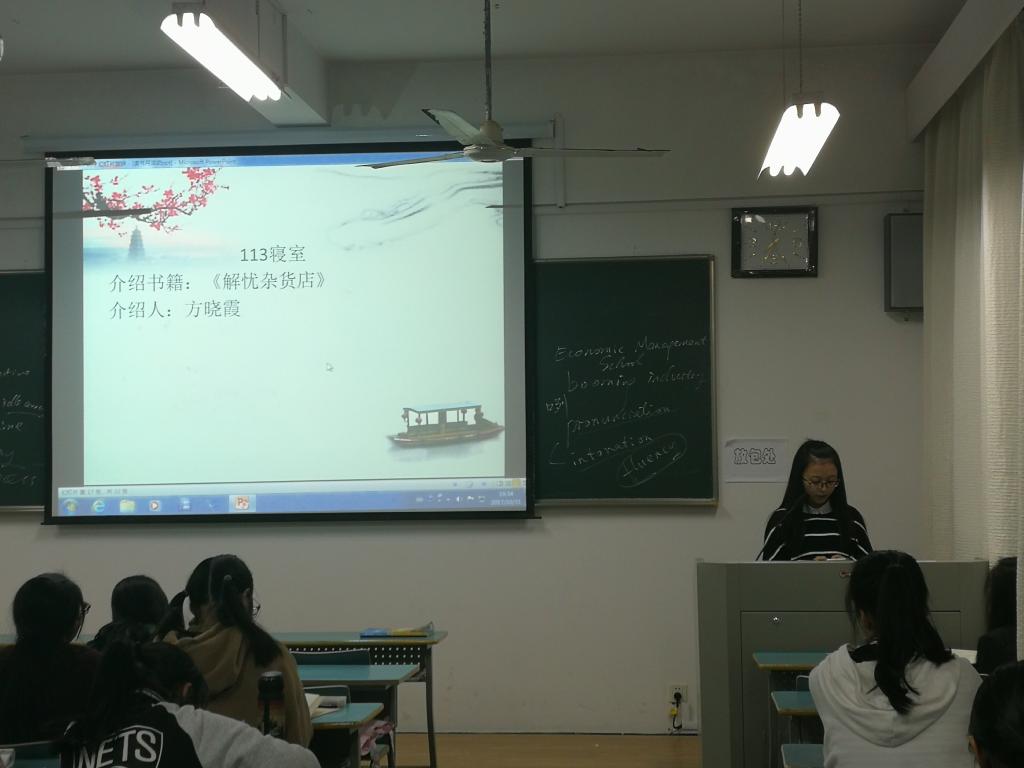 在班委简短的开场后,同学们以寝室为单位派代表轮流上台介绍书籍。同学们准备充分,提前做好PPT或读书笔记与大家分享。活动中共介绍了六本书:《局外人》、《穆斯林的葬礼》、《红楼梦》、《邮差总按两遍铃》、《杀死一只知更鸟》、《解忧杂货店》。最后,杨宁老师对此次活动作了简单总结并向同学们推荐了一份书单。他建议大家在今后的读书月活动中,可以尝试阅读书单上推荐的书籍,包括一些与文秘专业相关的书籍。