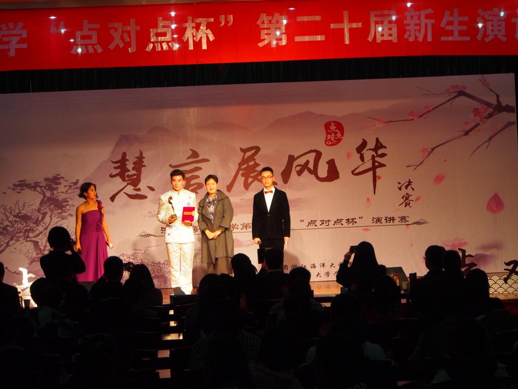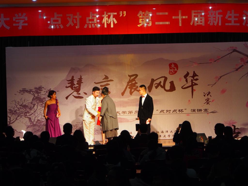 活动在诗朗诵《热爱生命》中拉开序幕,本次决赛分为千帆竞发(晋级战)与巅峰对战(争夺战),赛制的升级更能展现出海大学子们闪亮的风采。B17中文2 班的赵鸿儒发出了掷地有声的呐喊,“我们要涵养的是立足传统、继往开来的文化自觉,我们要涵养的是植根中华、面向世界的文化自信!”他的演讲让在场的人感受到,文明,特别是文化,是一个国家、一个民族的灵魂。而B17中文1 班的应海瑶为当今的小学生发声,“我不知道今天的中国需要的是什么样的人才,但我知道今天顶着熊猫眼的娃娃肯定做不了未来的栋梁。”在第二轮的冠军争夺战中,九位晋级选手上台抽取情景材料并进行即兴演讲。两分钟的时间里,两位选手的表现可圈可点,演讲铿锵有力、掷地有声,虽为即兴,却也展现出了选手们的技巧与能力。经过两个多小时的激烈角逐,最终我院赵鸿儒同学以高分斩获一等奖,应海瑶同学荣获二等奖。