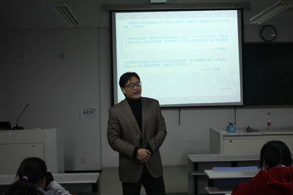 本次讲座主题为《作为一种超越日常生活的美学》,翟老师从美学的价值、日常生活对人的“异化”以及如何诗意地生存与审美地生活三个方面进行了具体阐述。首先,翟老师通过对《活着》这部作品的赏析引出美学超越日常生活的特性。接着,他给同学们放映了《迁徙的鸟》的片段,给同学们带来了极大的震撼,以此来点明美学启发和指引人们的作用,完美的阐释了美学的价值。接着,他通过马克思.韦伯提出的“规章对人的统治”这一概念以及一则情侣之间的短视频,给同学们点出日常生活对人的“异化”。最后,翟老师列举了海德格尔在二战前提出的“诗意栖居”概念来告诉同学们如何诗意地生存与审美地生活。