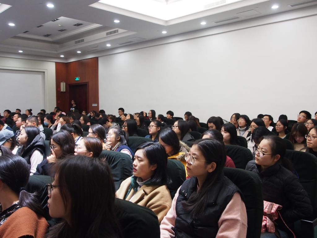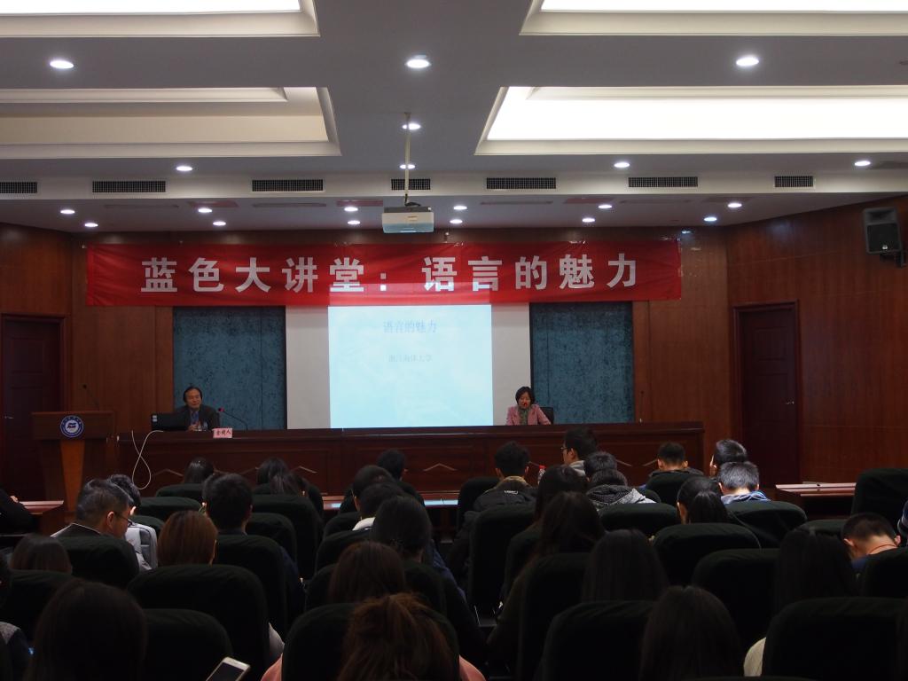 11月24日下午三点半,人文学院、教师教育学院在长峙校区图书馆一楼报告厅举办“语言的魅力”蓝色大讲堂。浙江大学金健人教授担任此次讲座主讲人,人文学院、教师教育学院党委副书记张祎星,团委副书记傅林静出席本次活动。