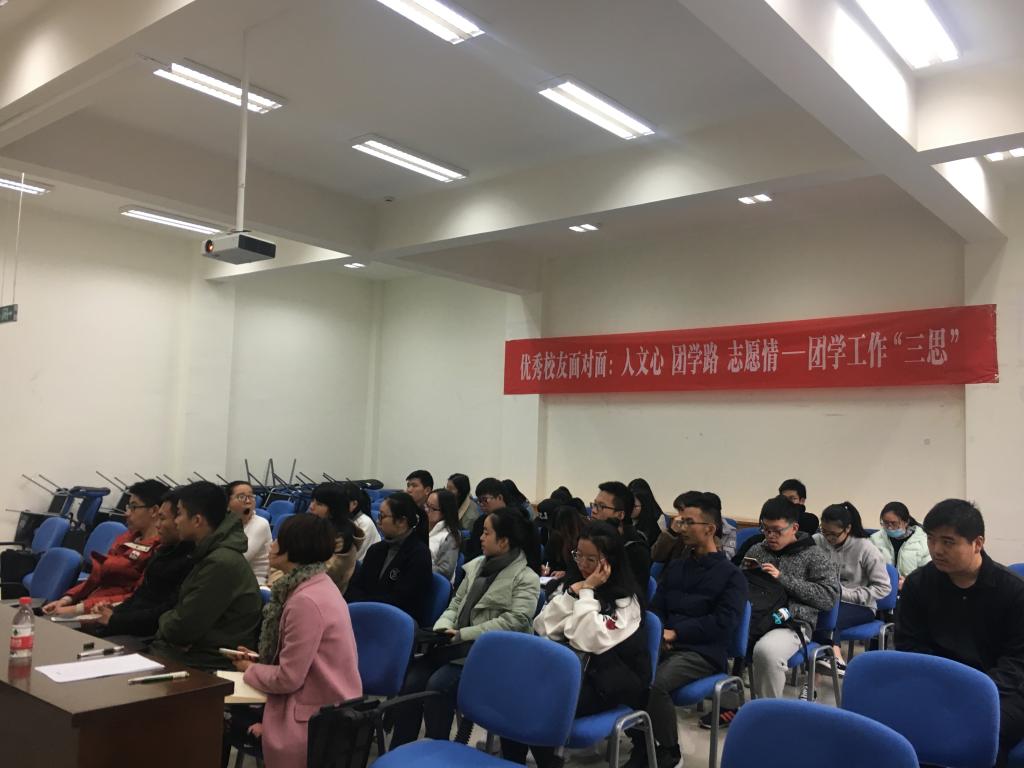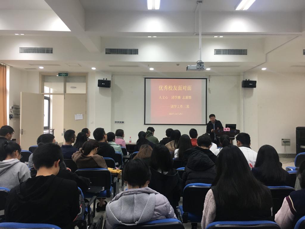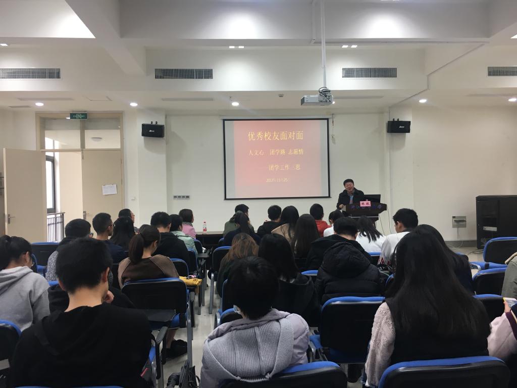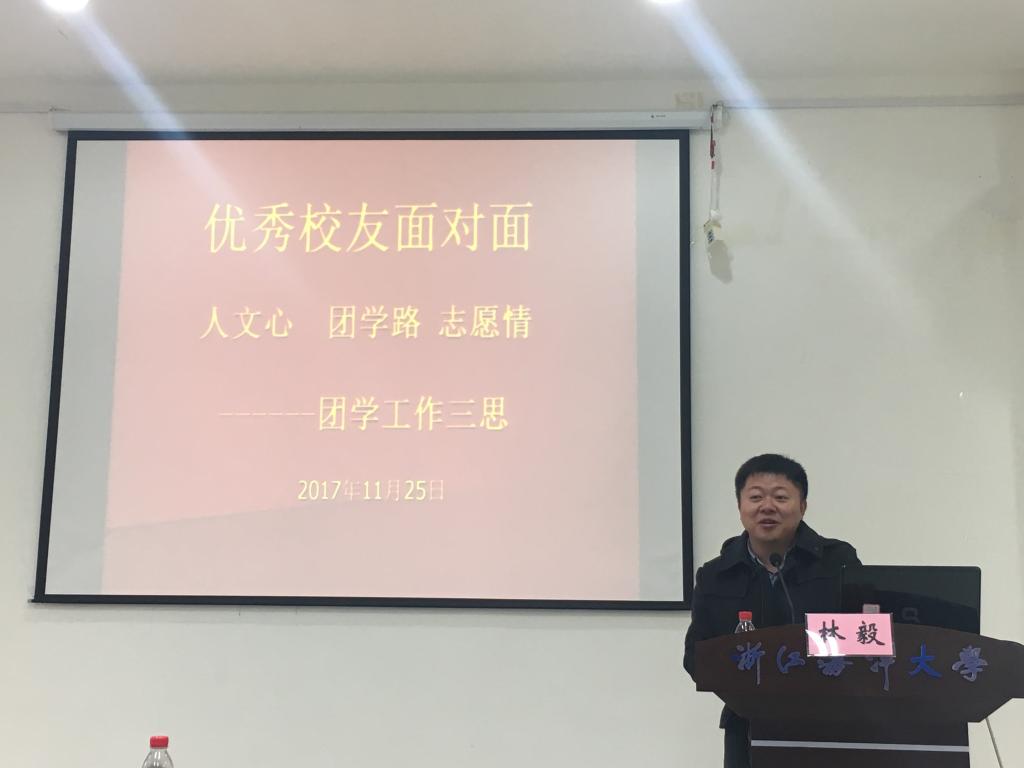 11月25日上午九点半,人文学院、教师教育学院优秀校友面对面活动在文理楼301顺利举行。人文、教育学院知名校友,杭州市金融工作办公室发展服务科科长,政工师、社工师林毅担任主讲人。人文学院、教师教育学院党委副书记张祎星,学工办主任曹虹,团委副书记傅林静出席此次活动。学院团学干部、班级班干部参加此次分享会。林毅学长从人文心、团学路、志愿情三方面介绍团学工作的所思所想。