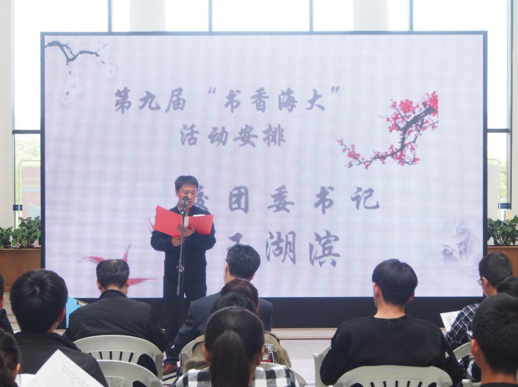 在启动仪式上,团委书记王湖滨代表主办方介绍了第九届书香海大活动安排,图书馆馆长韩伟表对2017年度永利集团官网学生阅读状况进行了分析报告。随后,吴中平书记指出大学生要善读书、常读书、读好书、学以致用。要求青年学生学习青年习近平,学习习近平总书记的读书精神,将读书作为一种生活方式、生命行为、生存状态,在读书学习中与时俱进。