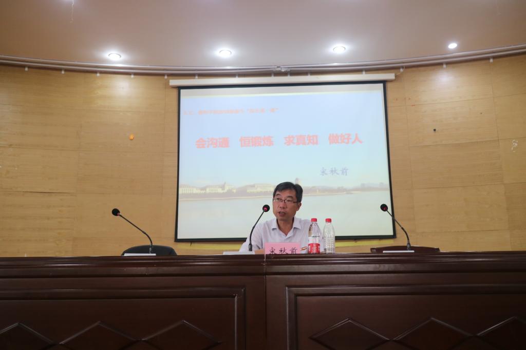随后,新生们迎来了宋秋前书记的新生课堂。宋书记平近亲和的语言充分拉进了与新生们的距离。他提出“会沟通,恒锻炼,求真知,做好人”的观点,并对学生们提出了几点要求和期望:第一,确立志向,明确方向;第二,学会学习,改进方法;第三,探索研究,追求卓越;第四,踏实做人,敢于担当;第五,坚持锻炼,健康身体。宋书记的“书记第一课”风趣幽默又内涵丰富,对新生们有着很大的启发。