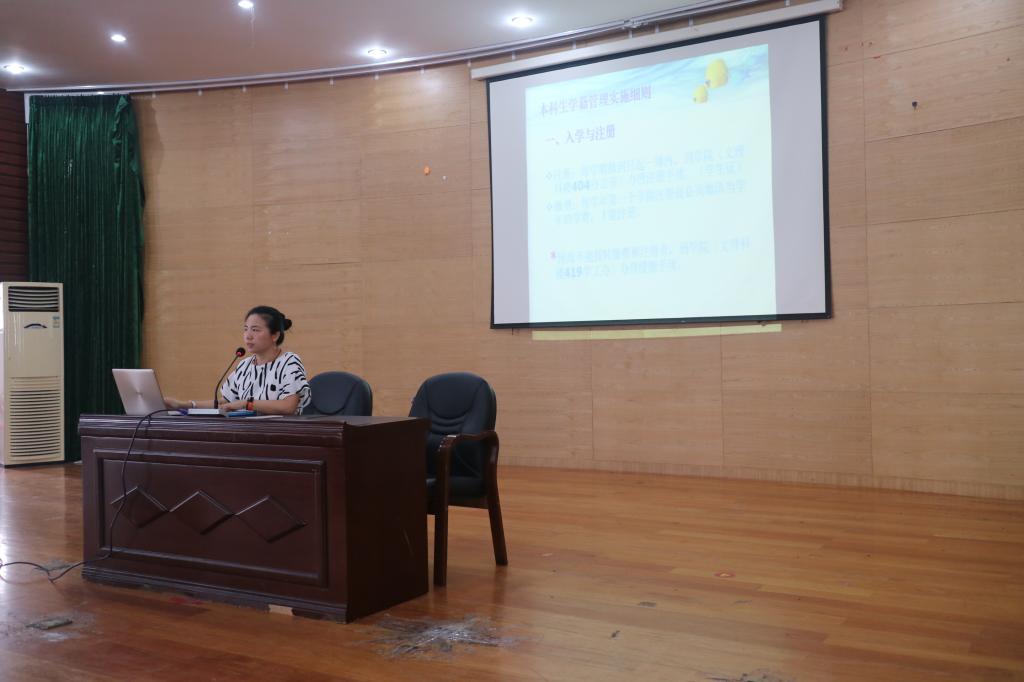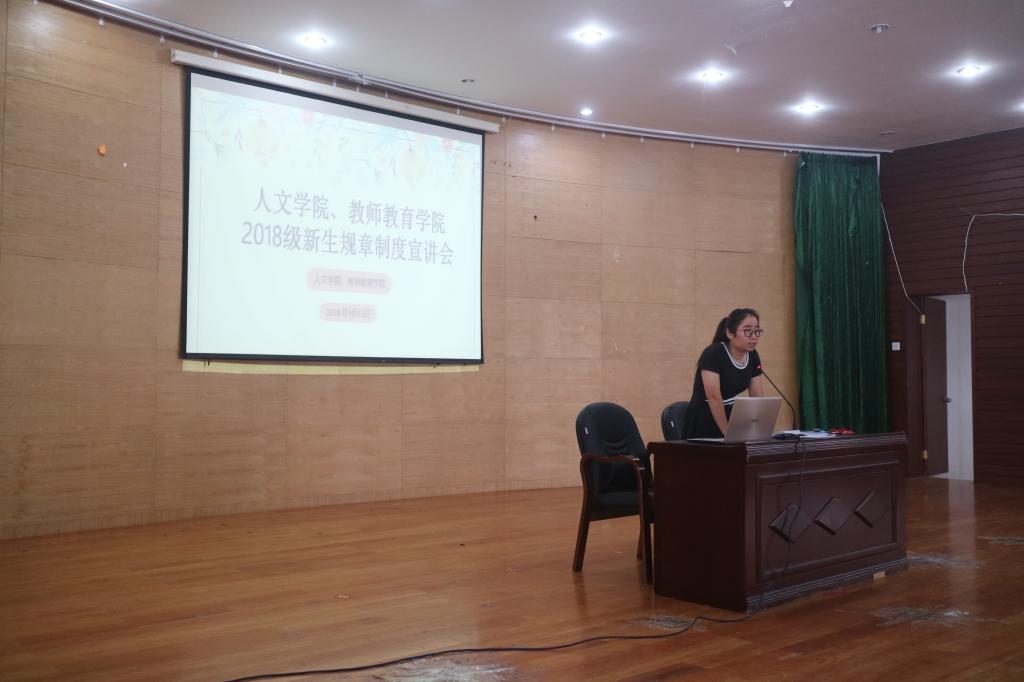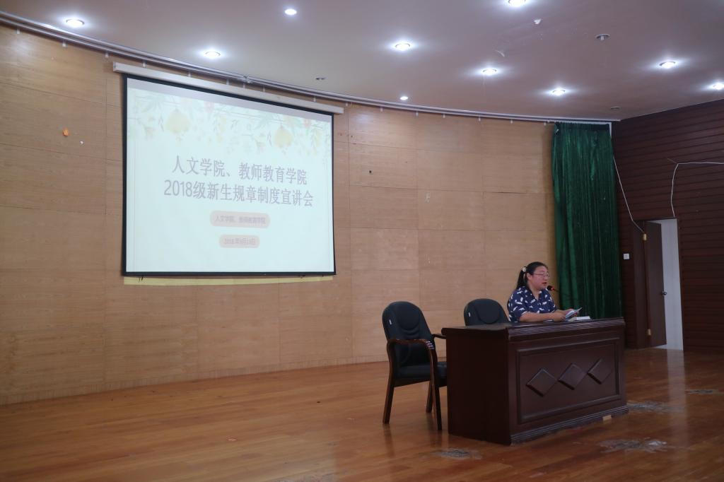 为帮助2018级新生更好地了解学校的规章制度,从而尽快适应大学的学习与生活、找准人生新阶段的奋斗方向。9月13日上午九点,人文学院、教师教育学院2018级新生规章制度学习与学分安排介绍及选修辅导在定海校区活动中心二楼报告厅顺利举行。本次活动由学院学生工作办公室主任曹虹主持,教学秘书王潇音、辅导员傅佳青参与讲解介绍。