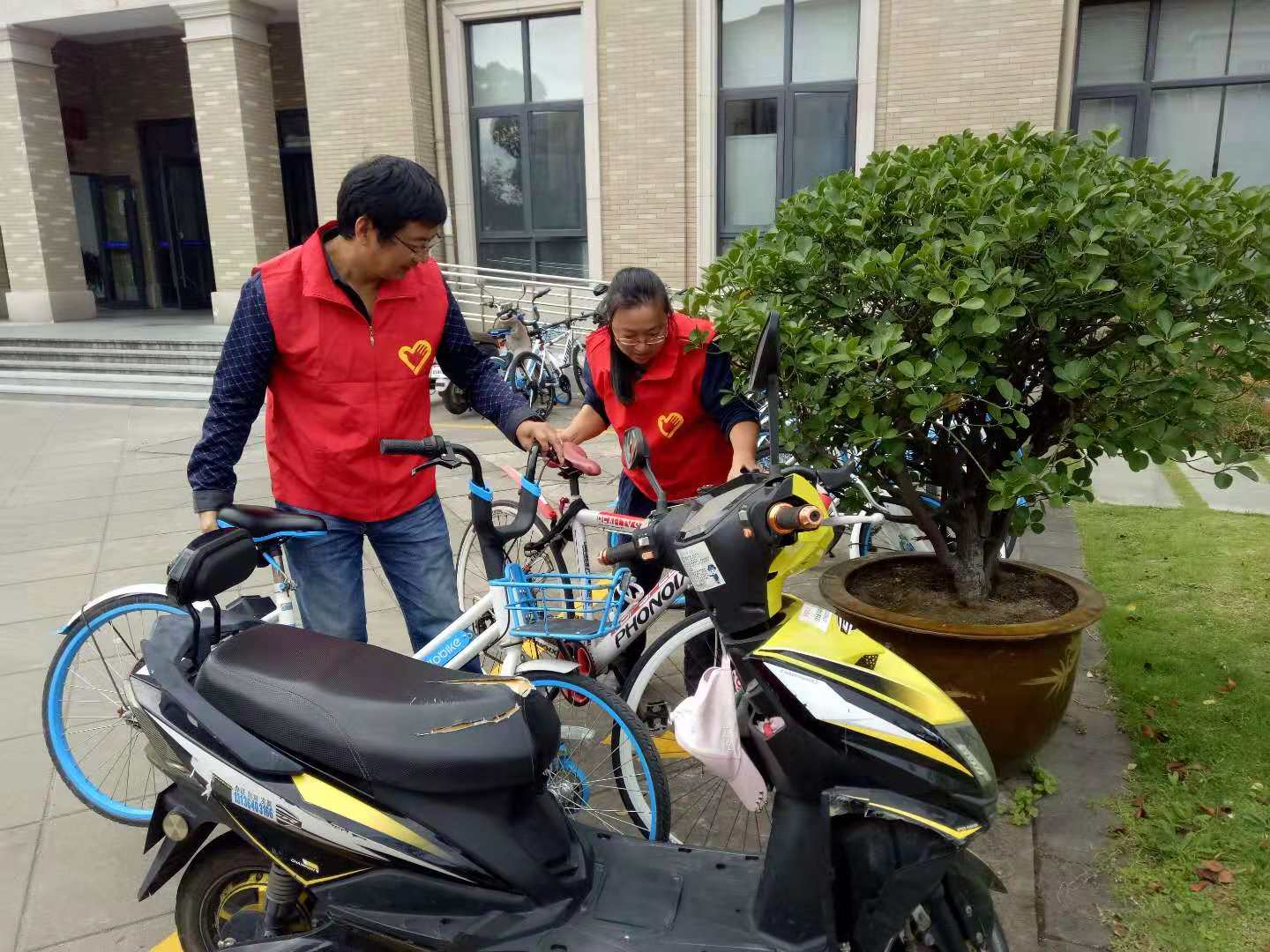 师生党员首先来到了食堂附近,沿着马路对周围的环境卫生进行了细致的检查,并将发现的纸屑、烟头等垃圾整理到垃圾桶内。同时对食堂门口的不规范停车行为也进行了整治,整理摆放乱停乱放的非机动车辆、共享单车。此外,师生党员也对篮球场附近的停车场进行了卫生排查,确保了周围环境的整洁和规范。经过志愿者的清理,校园环境有了明显改善。