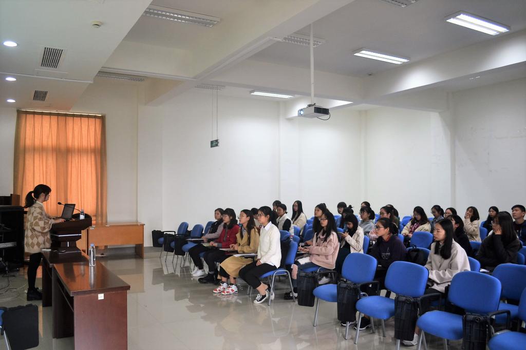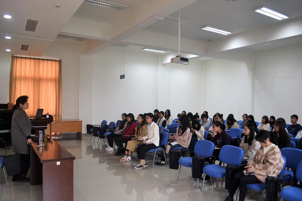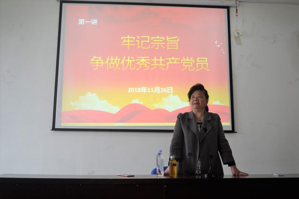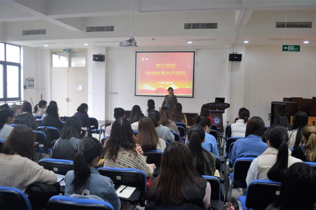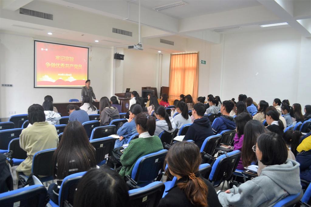 随后,沈慧君老师开启党训班第一课:《牢记宗旨,争做优秀党员》。沈老师分享了自己的入党经历,强调了 “思想上入党”的重要性,作为入党积极分子应时刻以党员的标准严格要求自己。她向学员们提出以下几点期望:第一,坚定理想信念,做一个有政治头脑的人;第二,牢记宗旨,学好为人民服务的本领;第三,要有强烈的集体荣誉感,团结所有同学;第四,树立较强的组织纪律性。