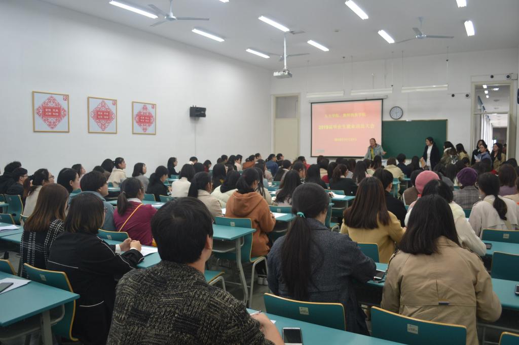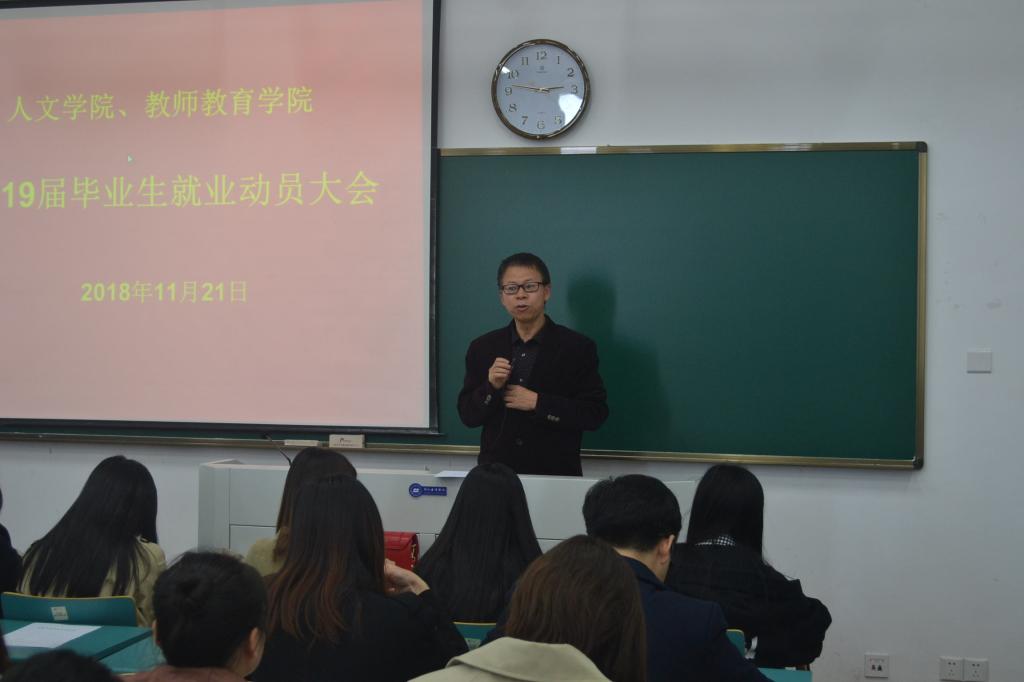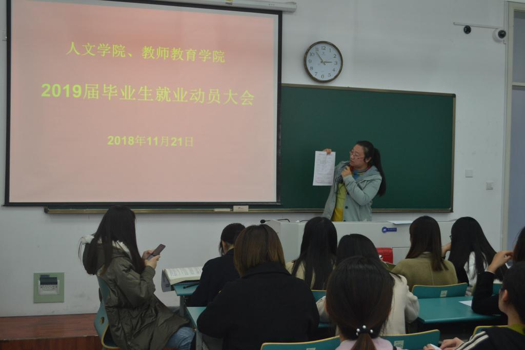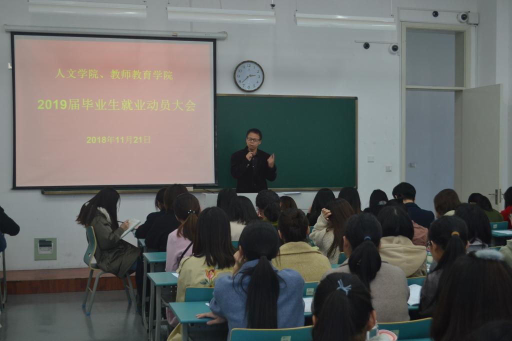 11月21日下午两点半,人文学院、教师教育学院2019届毕业生就业动员大会于公共教学楼401教室顺利举行。人文学院、教师教育学院副院长杨光熙、2019届毕业生参加本次会议。会议由学工办主任曹虹主持。