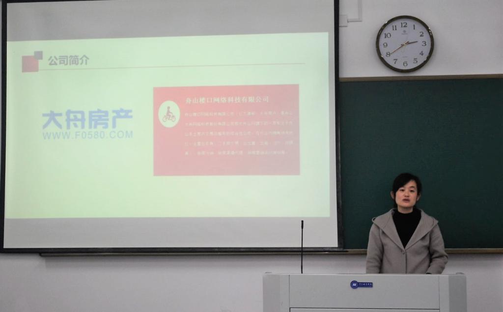 12月19日下午2点30分,舟山市大舟网络科技股份有限公司招聘宣讲会在长峙校区公共教学楼410顺利举行。人文学院、教师教育学院大四学生参加了本次宣讲会,宣讲会由舟山市大舟网络科技股份有限公司人事部沈经理主讲。