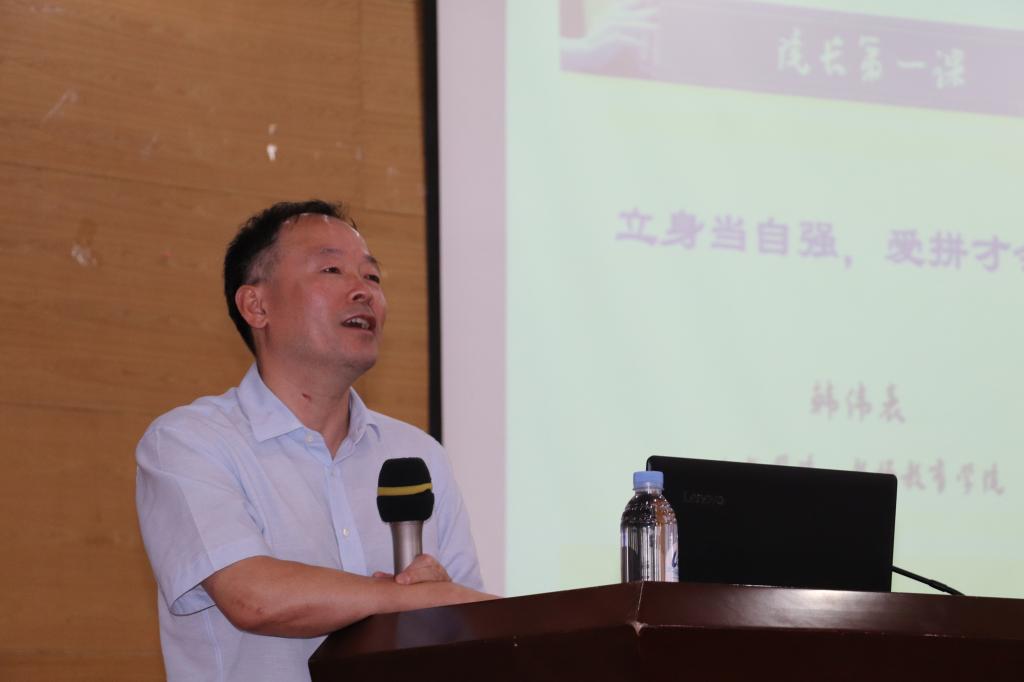 随后,新生们迎来了院长韩伟表的新生课堂。韩院长用直观形象的数据向新生们强调了学习的紧迫性;又以“天行健,君子以自强不息”勉励新生自强自立。并对新生们提出了几点要求和期望:第一,利用课余,深入探究;第二,学会学习,改进方法;第三,读万卷书,行万里路;第四,目标明确,持之以恒;第五,明辨是非,三思而行;第六,坚持锻炼,健康身体。韩院长的“院长第一课”从小事入手,高处着眼,风趣幽默又内涵丰富,为新生们带去了很大的启发。