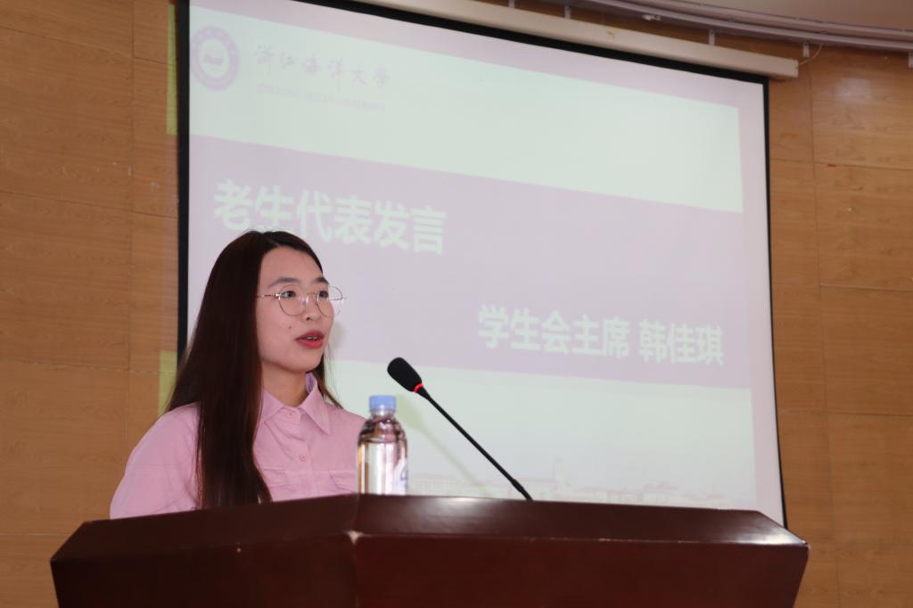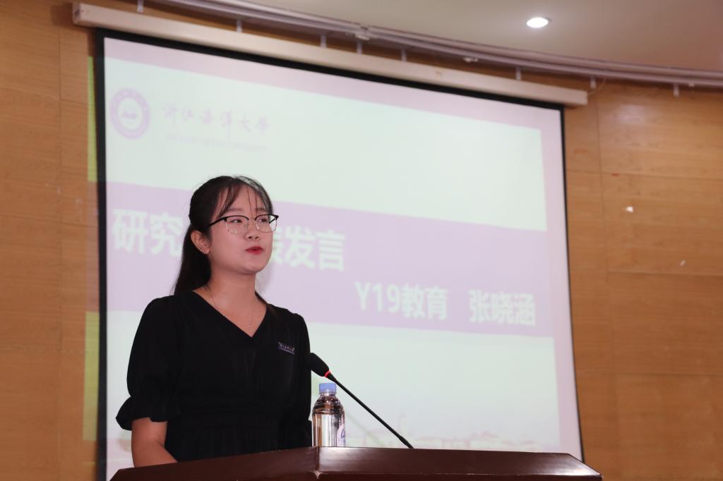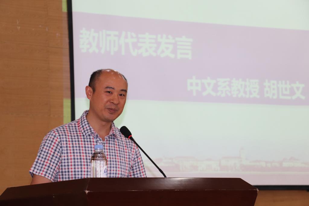 在新生们观看了文教学院专业宣传片,对学院概况有了大致的认识之后,大会正式开始。首先,余全介老师介绍了出席大会的学院领导、班主任以及教师代表。接着,中文系教授胡世文、B19小教1班主任汪晓阳分别作为教师代表和班主任代表进行了发言,勉励新生认真学习,努力奋斗。学生会主席韩佳琪、B19中文2陈家乐、Y19教育张晓涵分别作为老生代表、新生代表以及研究生代表发言。