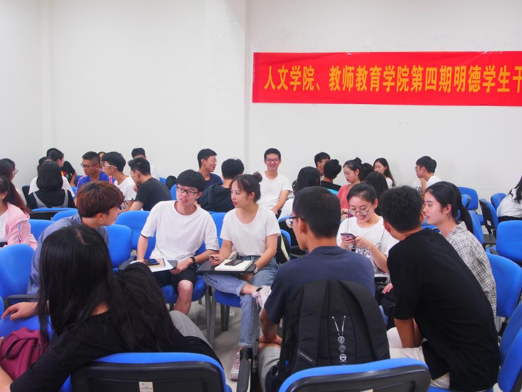 活动伊始,船舶与机电工程学院学生会主席王江华与人文学院、教师教育学院学生会主席韩佳琪对两院学生组织和本次活动的目的做了简单介绍。随后,两院的学生干部门围坐成圈,分享工作经历,探讨工作难题,交流工作心得,现场气氛十分热烈。在活动结束之际,学生干部们还纷纷交换联系方式,以便日后继续讨论学习。