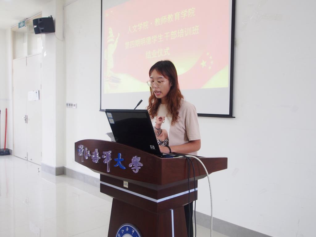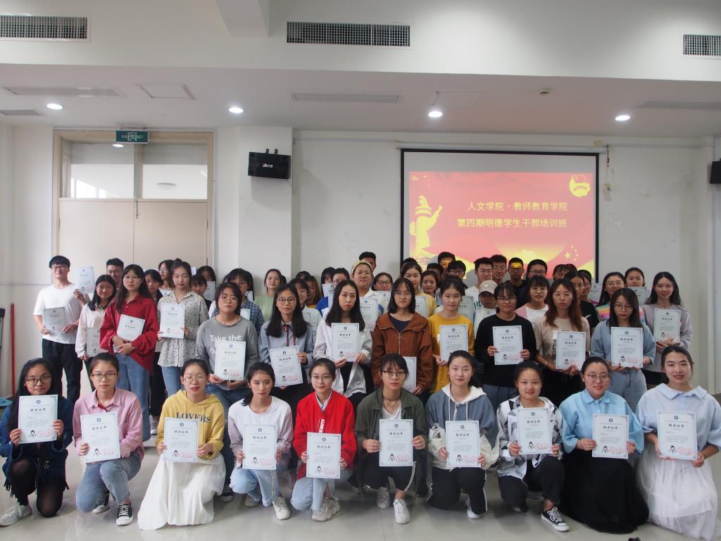 2019年9月23日中午十二点半,人文学院、教师教育学院第四期明德干部培训班结业仪式暨证书颁发仪式在文理楼301顺利举行。本次活动由学院分团委学生副书记金慧佳主持,学院全体团学干部参加。