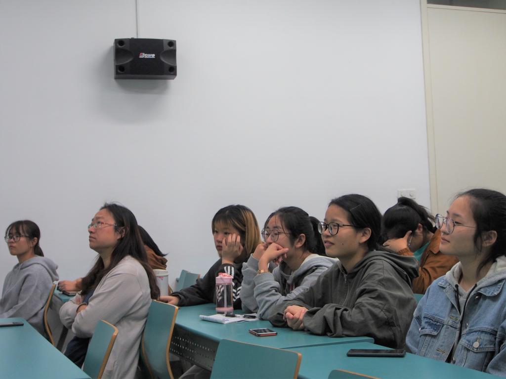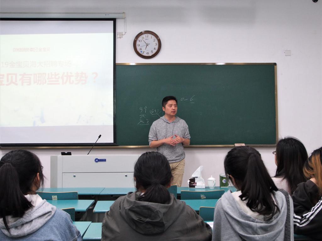 宣讲会伊始,胡霖谈起琼.博恩丝女士的灵感和行动,以及对金宝贝的突出贡献,向同学们简单地介绍金宝贝的起源史,建议同学们善于观察,随时关注生活。接着他借助视频、图片、案例等方式向大家展示了金宝贝的硬件设施、师资力量等力。随后他通过装修风格,教具采买,师资精选等方面具体介绍了金宝贝“真诚、积极、关爱、童心、世界性”的定位,旨在吸引大家对金宝贝的目光。宣讲会结束之际,他与同学们聊起各自的职业规划,立足自身,现身说法,鼓励同学们敞开心扉,大胆交流。此外,他细心询问同学们的学习和生活,鼓励大家都能“成为自己想成为的人”,得偿所愿。