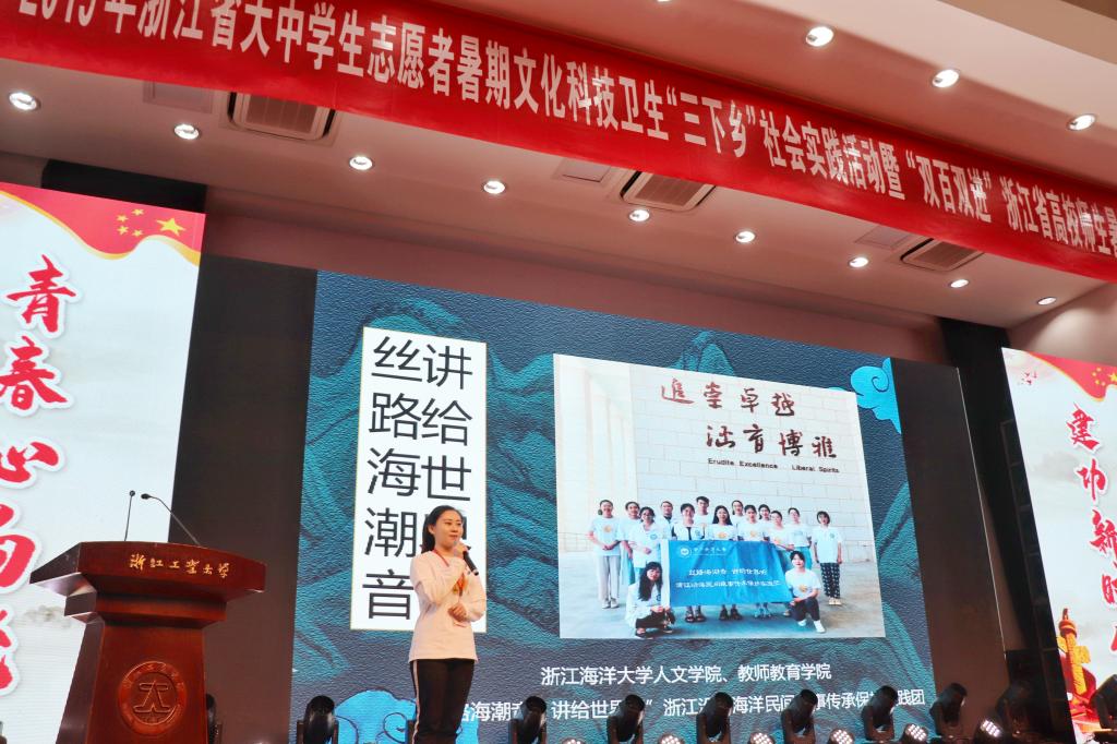 唱响青春之歌,弘扬实践之美。2019年12月19日至20日,由浙江省委宣传部、省文明办、省教育厅、团省委、省学联共同主办的2019年浙江省暑期社会实践风采大赛决赛在浙江工业大学举行。人文学院、教师教育学院“丝路海潮音,讲给世界听”浙江沿海海洋民间故事传承保护实践团代表学校参赛。