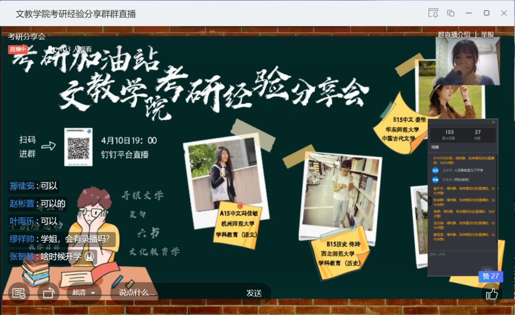 人文、教育学院B15历史班佟玲(西北师范大学学科教育历史专业)、B15中文班冯佳敏(杭州师范大学学科教育语文专业)、陈玮(浙江师范大学学科教育语文专业)以及姜怡(华东师范大学中国古代文学专业)四位优秀校友先后以视频直播的形式分享了各自的考研经验。在分享过程中,她们以自身经历为例,辅以各类资料,详细介绍了考研复试的具体流程,着重指出了准备过程中的重难点。分享结束后,同学们纷纷提出关于考研的疑问与困惑,老师们与学姐们热心解答,气氛十分热烈。
