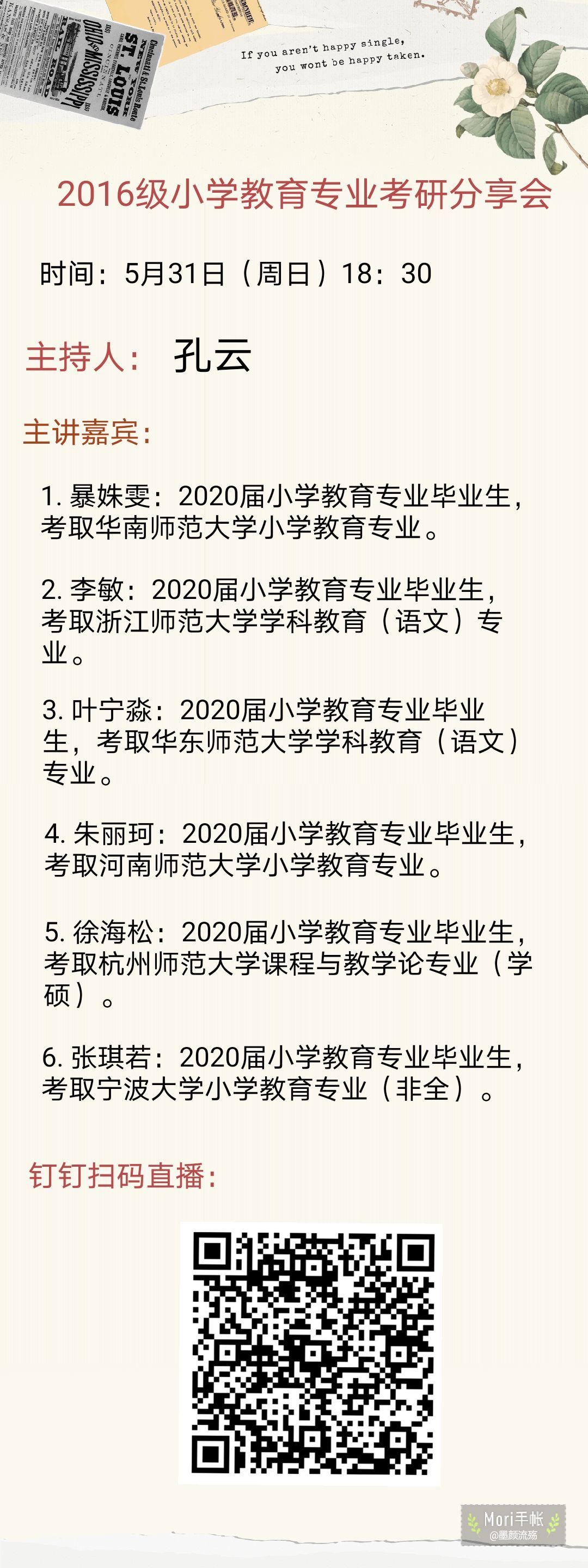 为帮助小教专业的同学们掌握更多与考研相关信息和技巧,明确考研意向和方向,人文学院、教师教育学院小学教育专业于5月31日晚六点半在钉钉平台顺利召开了考研经验分享会。本次分享会由小学教育系系主任孔云老师主持,学院小教专业学子踊跃参加。