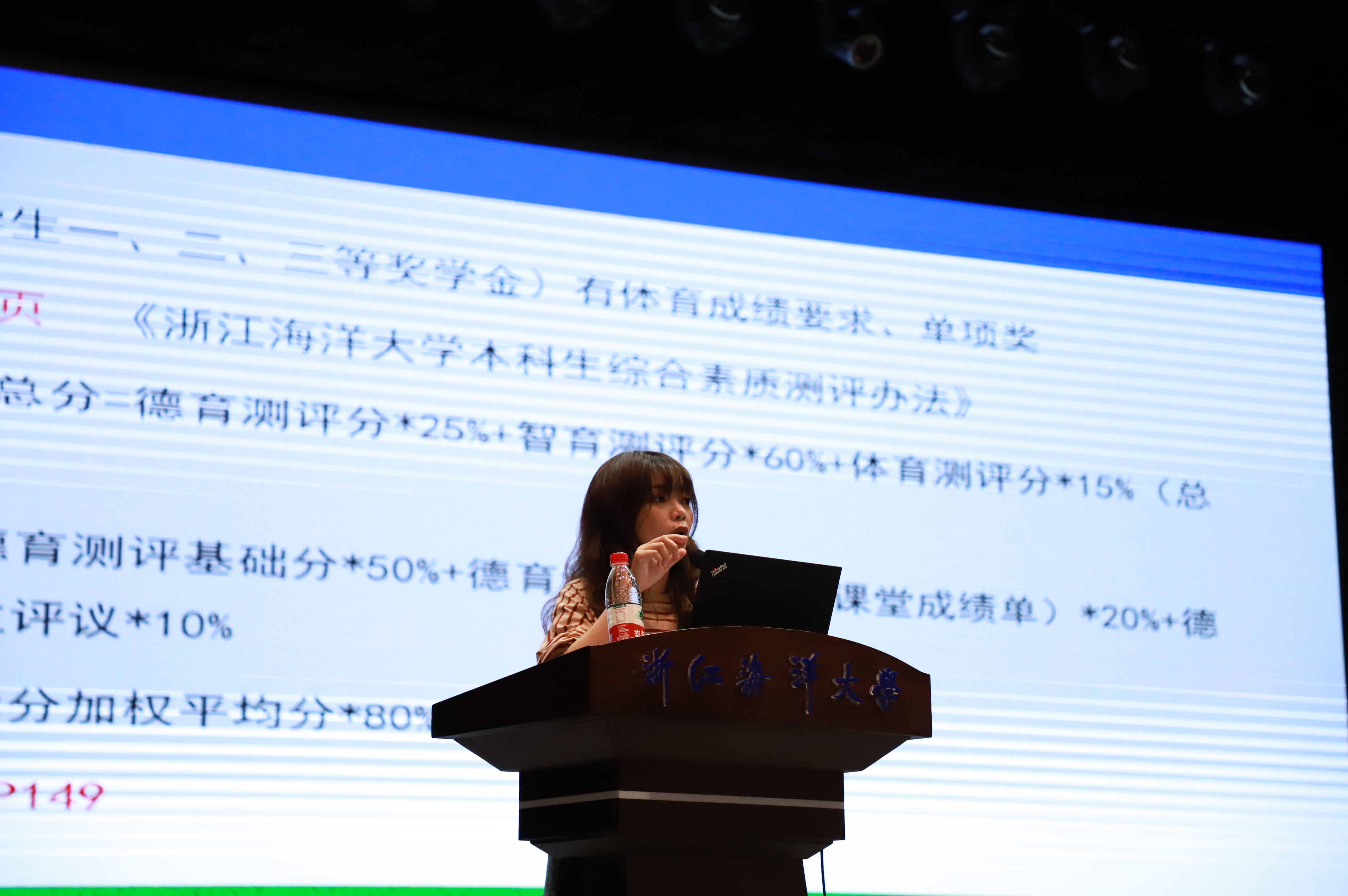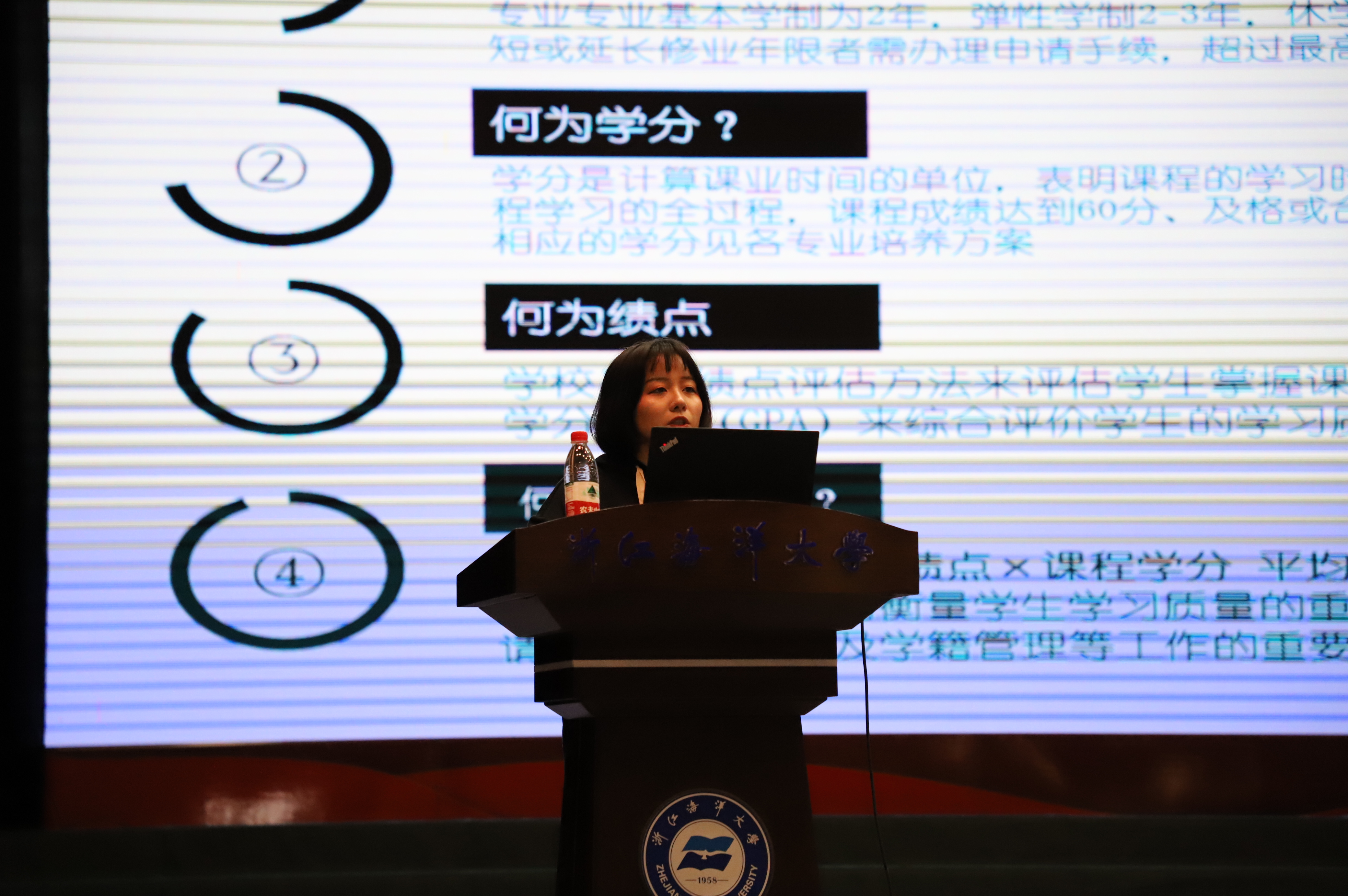 会上,教务员李奕萱老师就学籍管理进行分点解读,从学制与学分、考勤及纪律要求、课程考核与成绩记载、免修与免听课、选课要求、学业警示及进程调整、毕业结业要求等方面进行阐述,同时针对转专业与转学、休学、复学、退学等情况也做了具体的介绍。随后,辅导员张军老师根据学生规章制度手册,重点讲解了学校资助体系及相关政策,并简要地介绍了体质健康、宿舍管理及安全教育等相关事项,让新生们对学校的规章制度有一定的了解,对未来的学习生活有所规划。最后,学工办主任傅林静老师主要介绍了评优评先、违纪惩处、第二课堂成绩单、志愿公益、校园文化活动、创新创业学分以及学科竞赛等内容。针对yl9193永利集团的办学特色,傅老师特别为同学们介绍了师范生技能大赛、中华经典诵读大赛以及志愿服务大赛,鼓励同学们把握机会,积极参与,挖掘自己的潜力,让自己的大学生活更加精彩,让自己的人生更有意义。